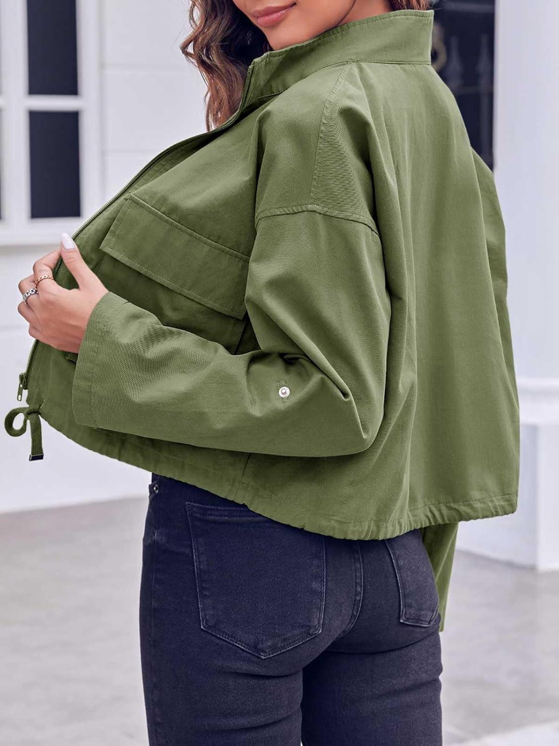 Tankaneo Women Casual Cropped Jackets Zip Up Lightweight Military Safari Short Utility Coat with Pockets(Army Green)