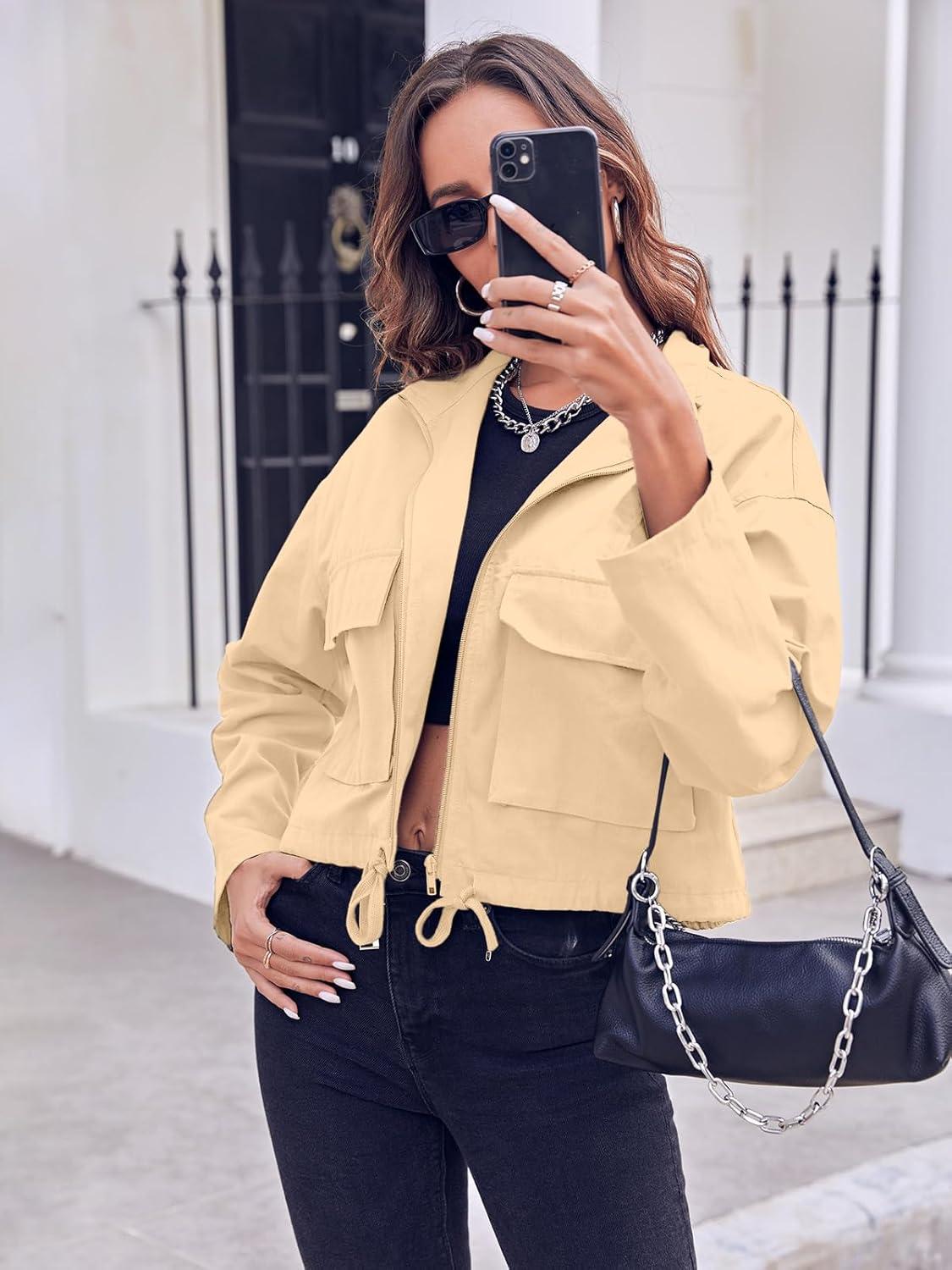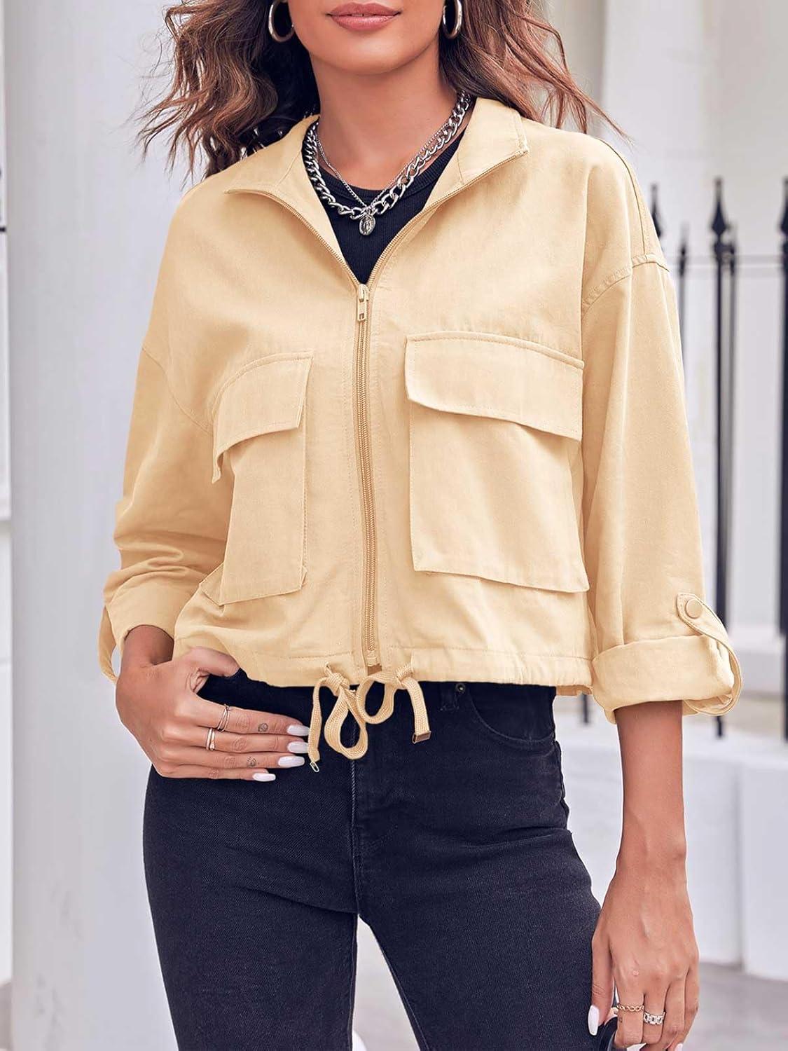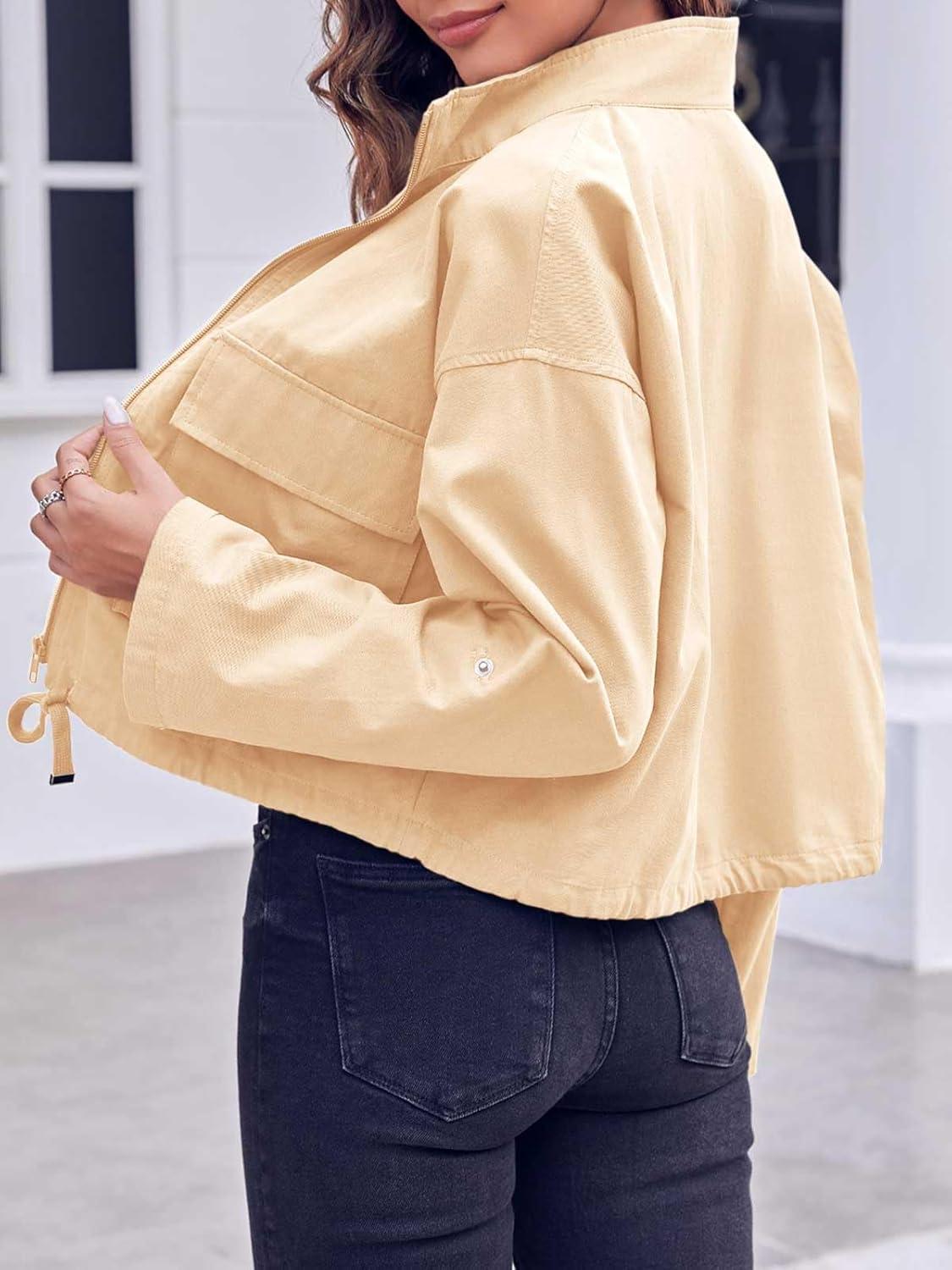 Tankaneo Women Casual Cropped Jackets Zip Up Lightweight Military Safari Short Utility Coat with Pockets(Beige)