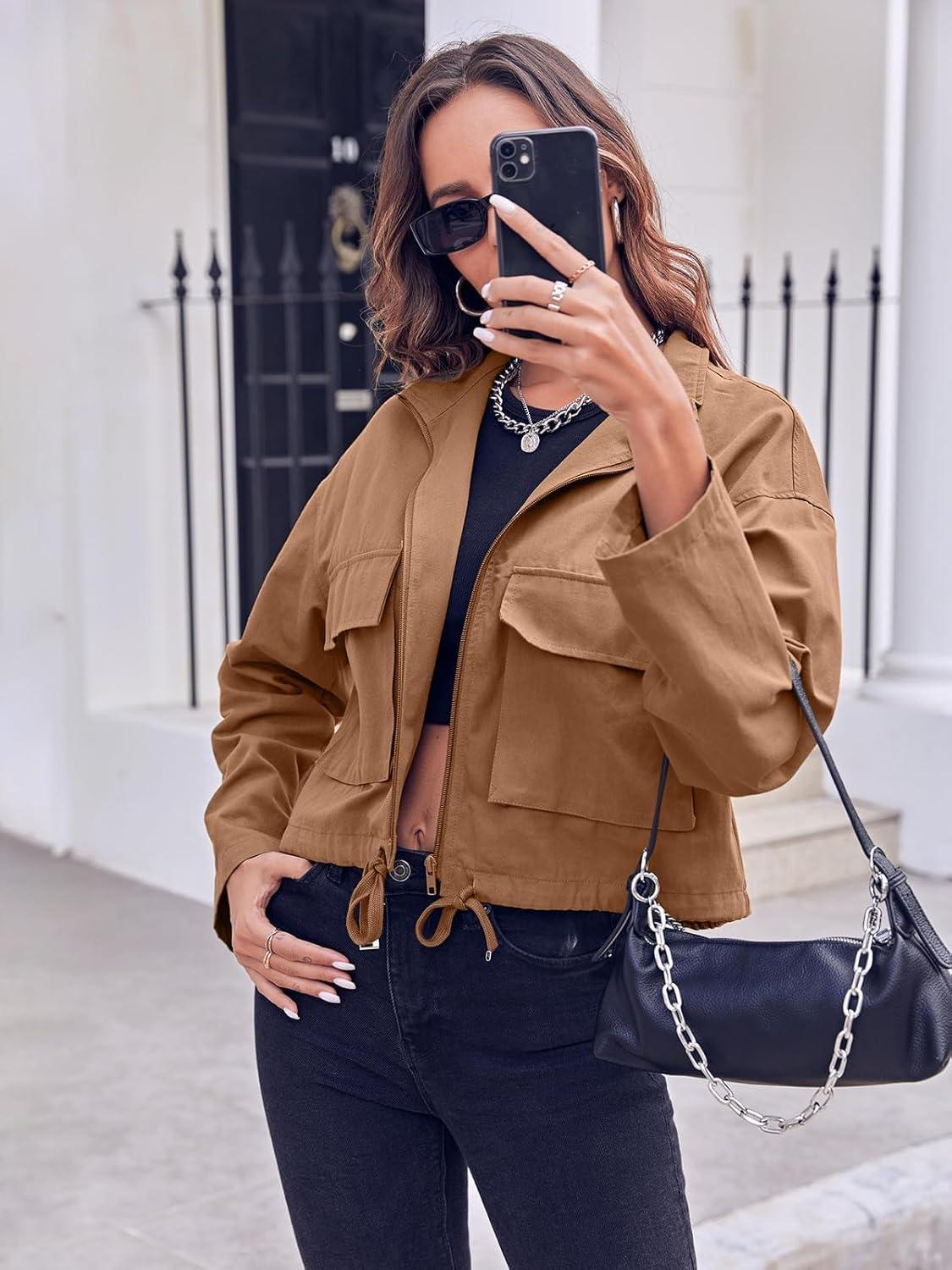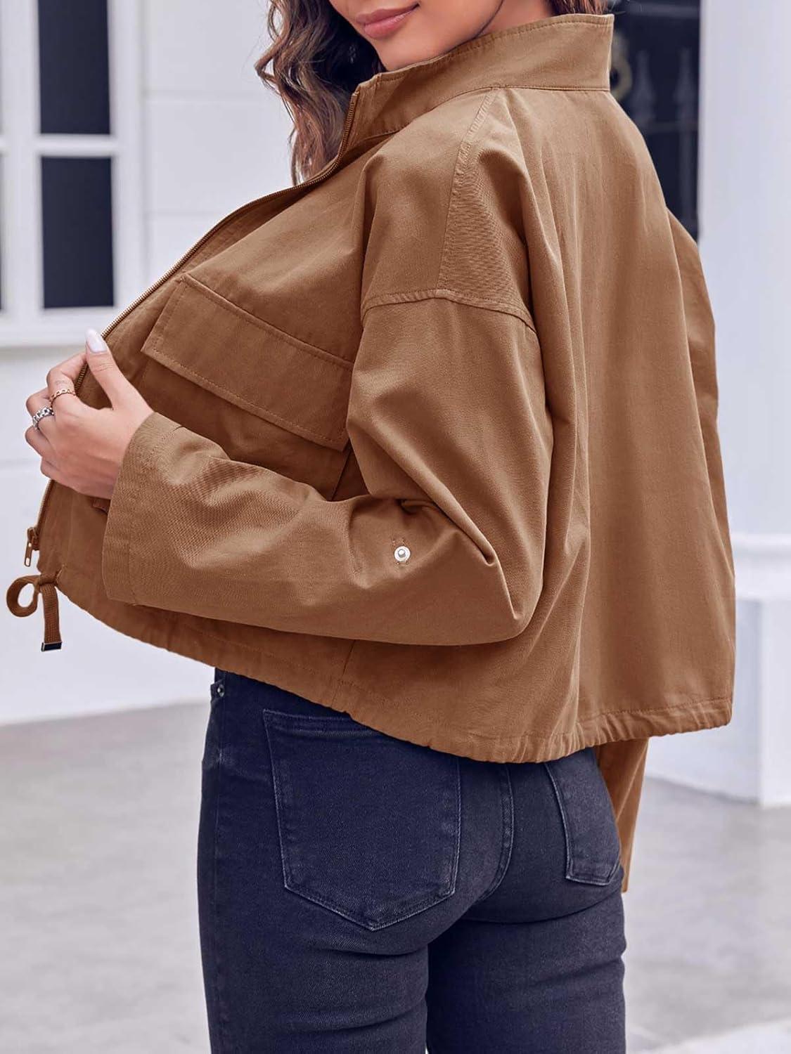 Tankaneo Women Casual Cropped Jackets Zip Up Lightweight Military Safari Short Utility Coat with Pockets(Brown)