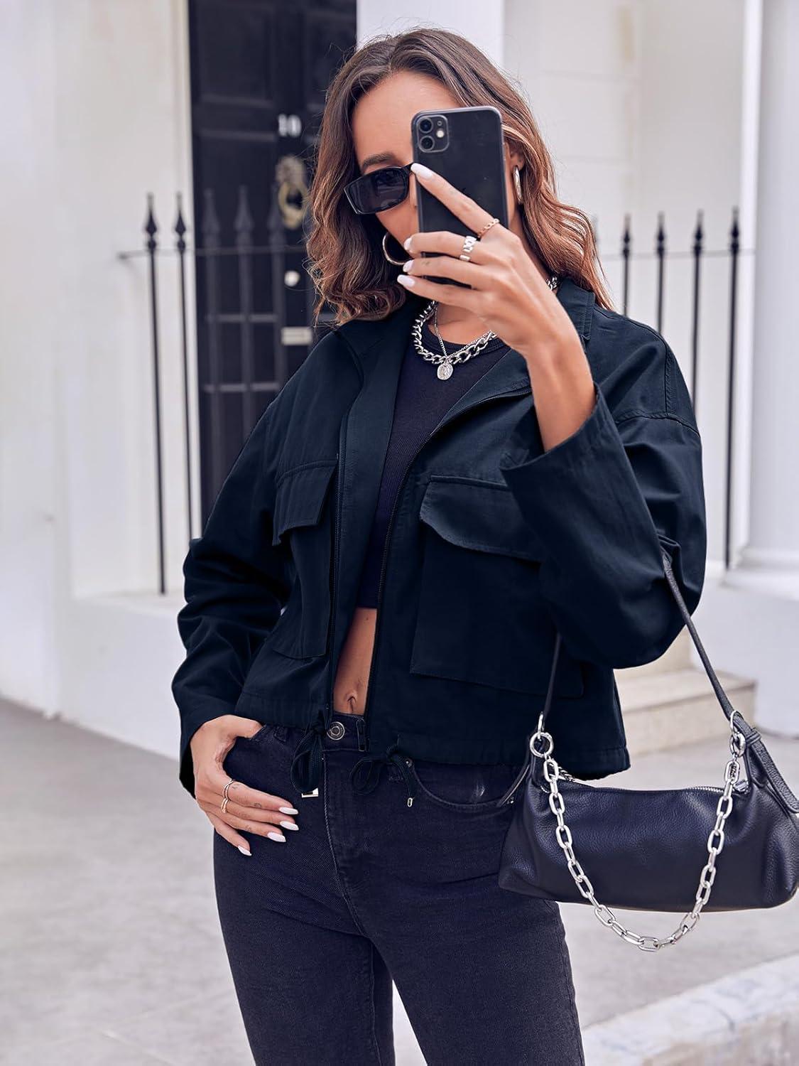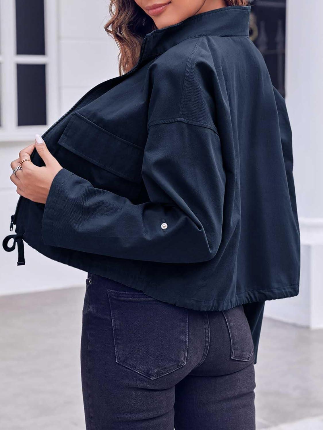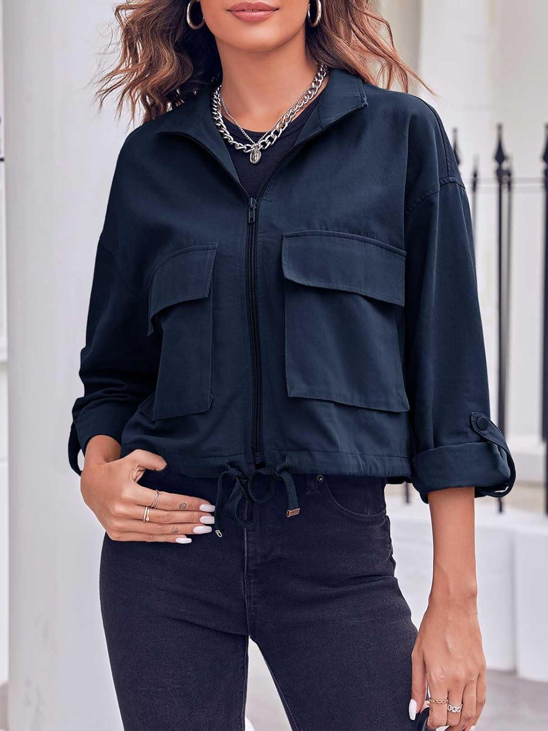 Tankaneo Women Casual Cropped Jackets Zip Up Lightweight Military Safari Short Utility Coat with Pockets(Dark Blue)