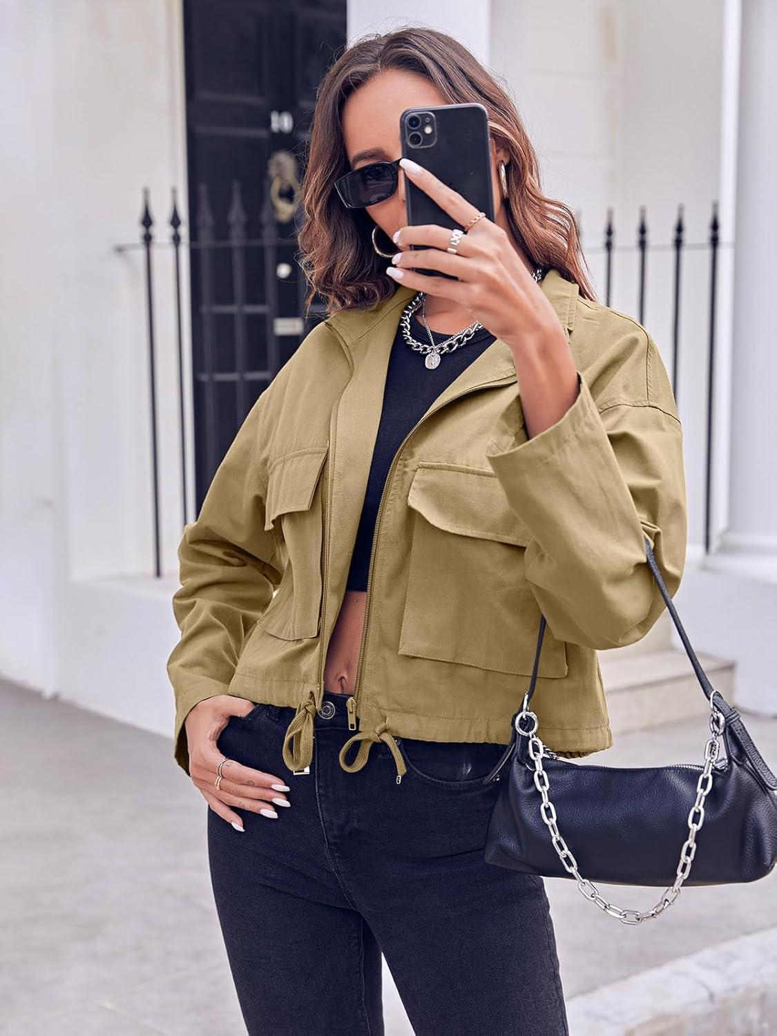 Tankaneo Women Casual Cropped Jackets Zip Up Lightweight Military Safari Short Utility Coat with Pockets(Khaki)