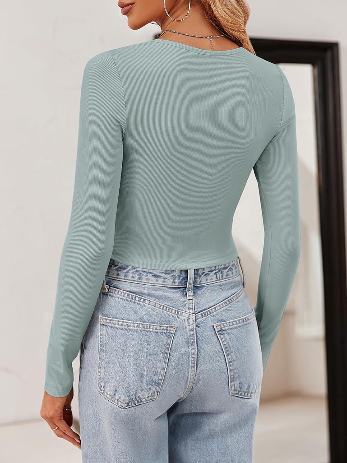 Tankaneo Women Crop Tops Long Sleeve Ribbed Slim Fit Workout Cropped Tee Y2K Short T-Shirts(Blue-grey)