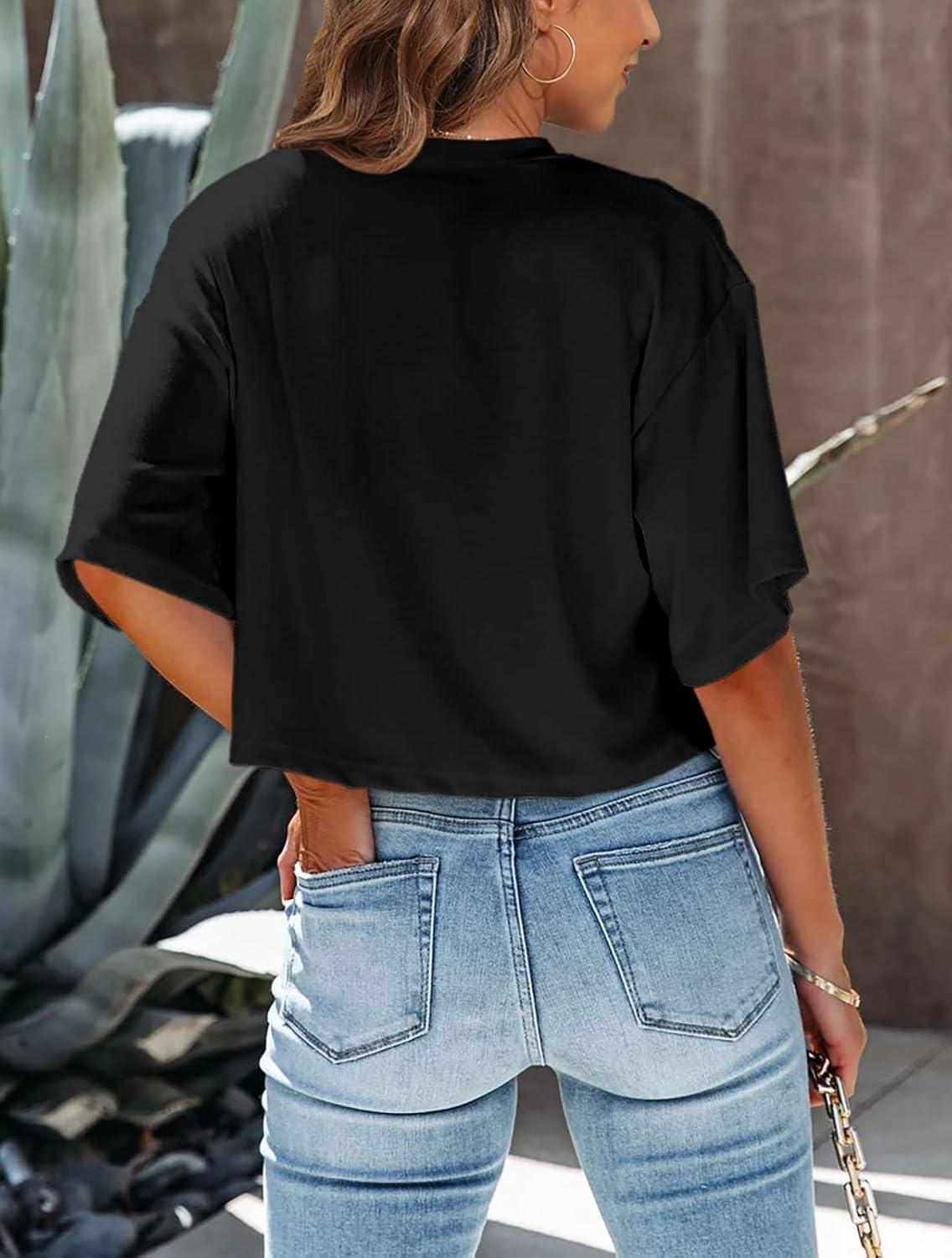 Tankaneo Women Half Sleeve Cropped T-Shirts Drop Shoulder Round Neck Crop Tops Casual Summer Solid Color Basic Tees(02-black)