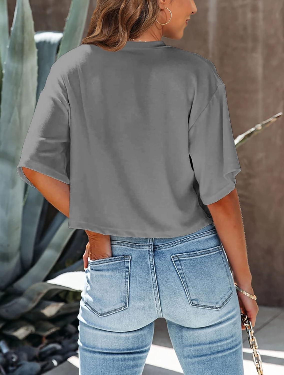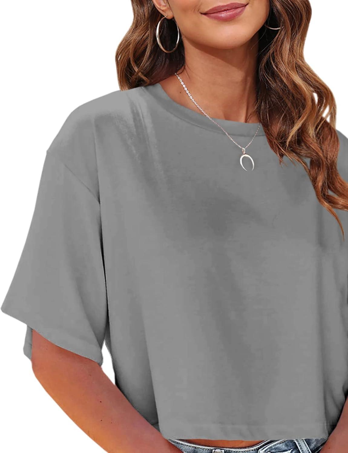 Tankaneo Women Half Sleeve Cropped T-Shirts Drop Shoulder Round Neck Crop Tops Casual Summer Solid Color Basic Tees(06-gray)