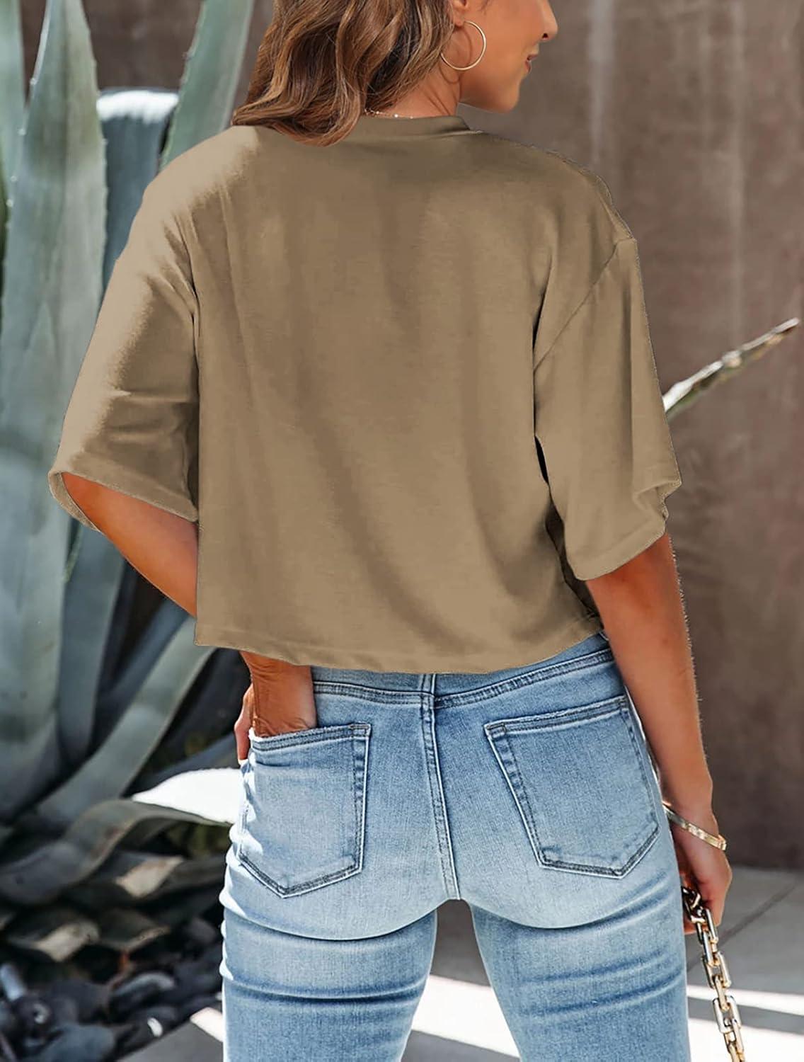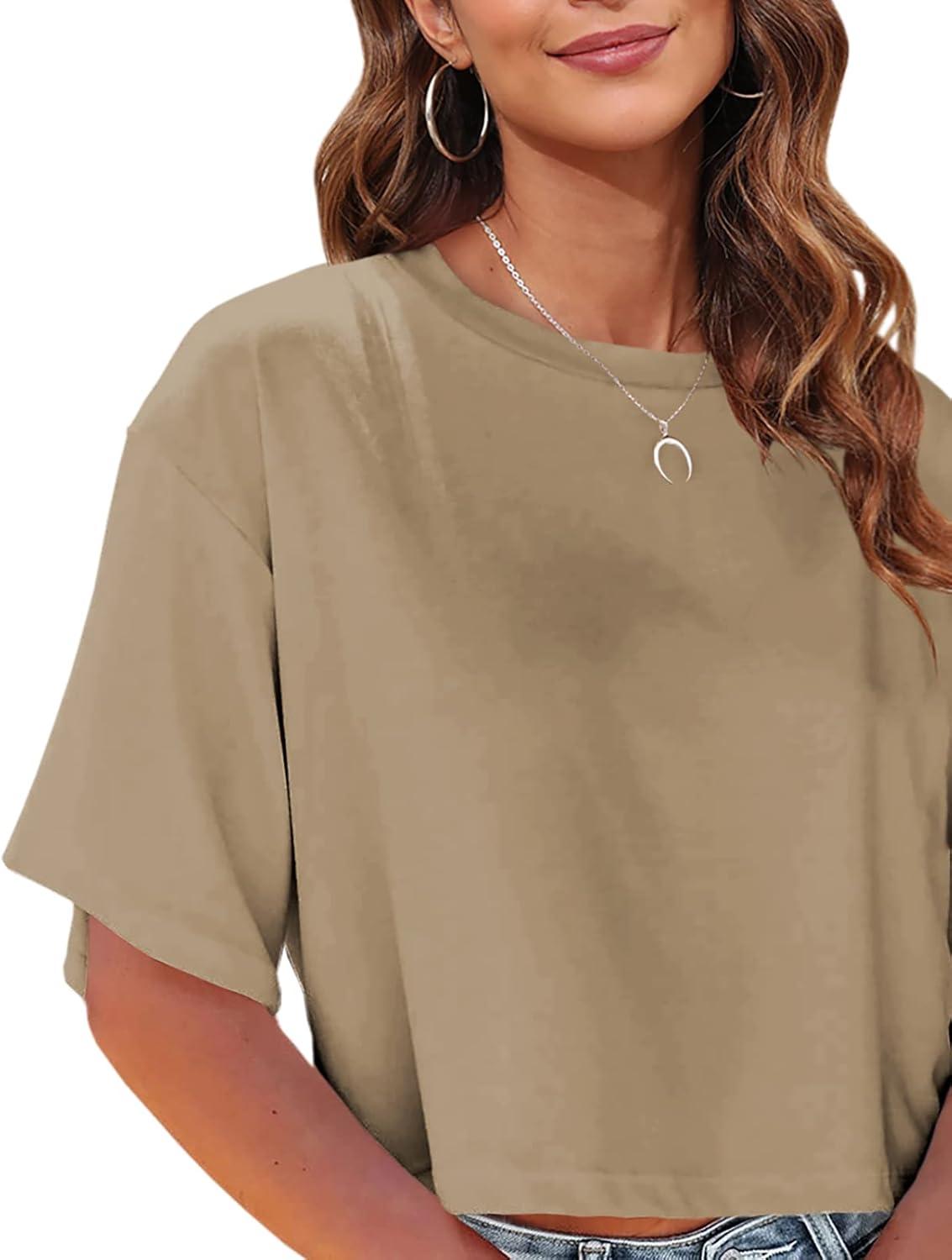 Tankaneo Women Half Sleeve Cropped T-Shirts Drop Shoulder Round Neck Crop Tops Casual Summer Solid Color Basic Tees(07-dark Khaki)
