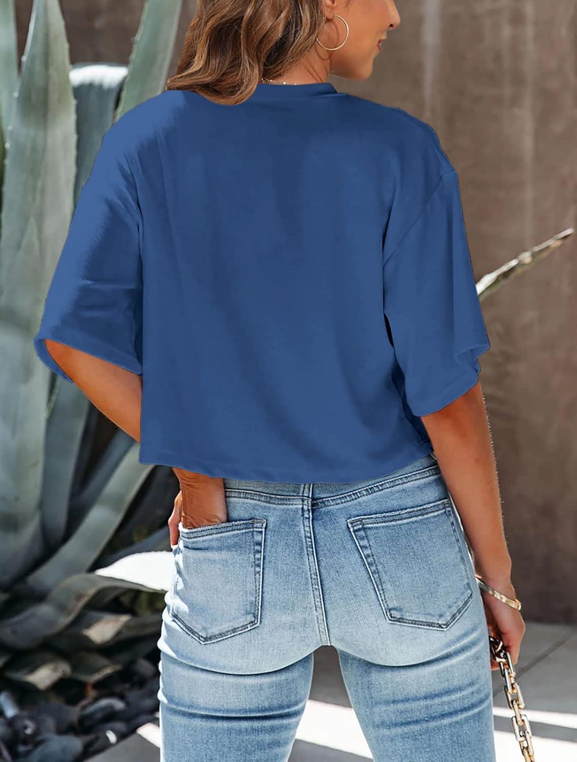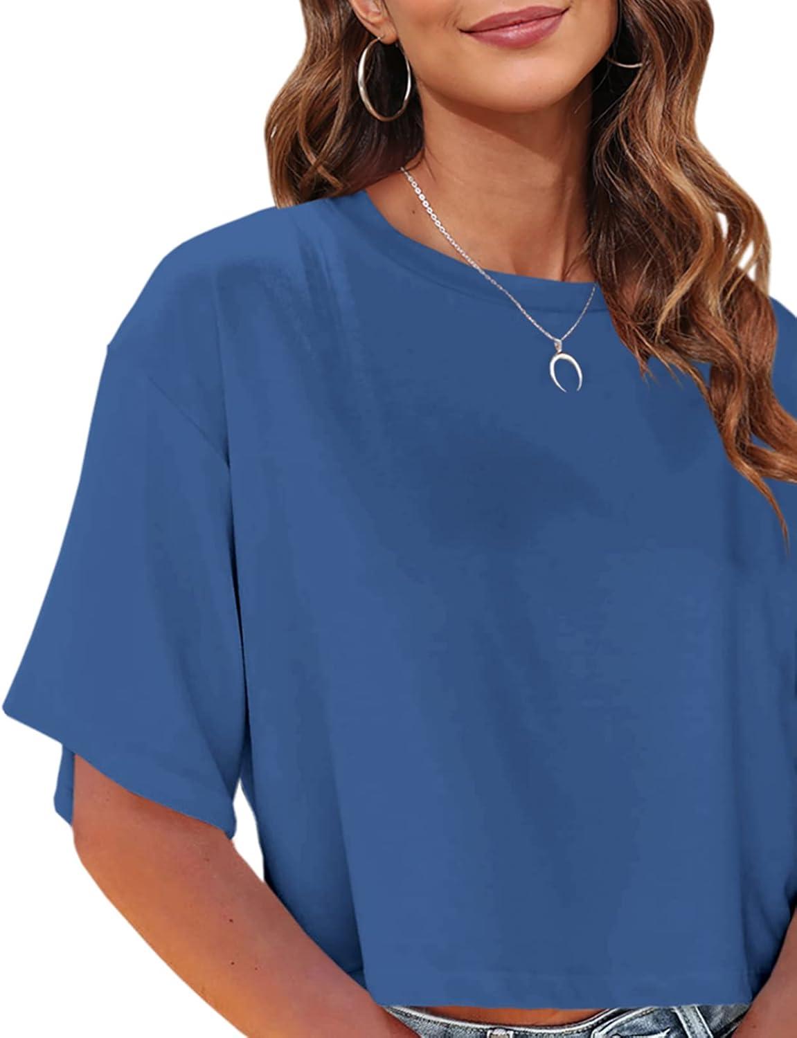 Tankaneo Women Half Sleeve Cropped T-Shirts Drop Shoulder Round Neck Crop Tops Casual Summer Solid Color Basic Tees(08-navy Blue)