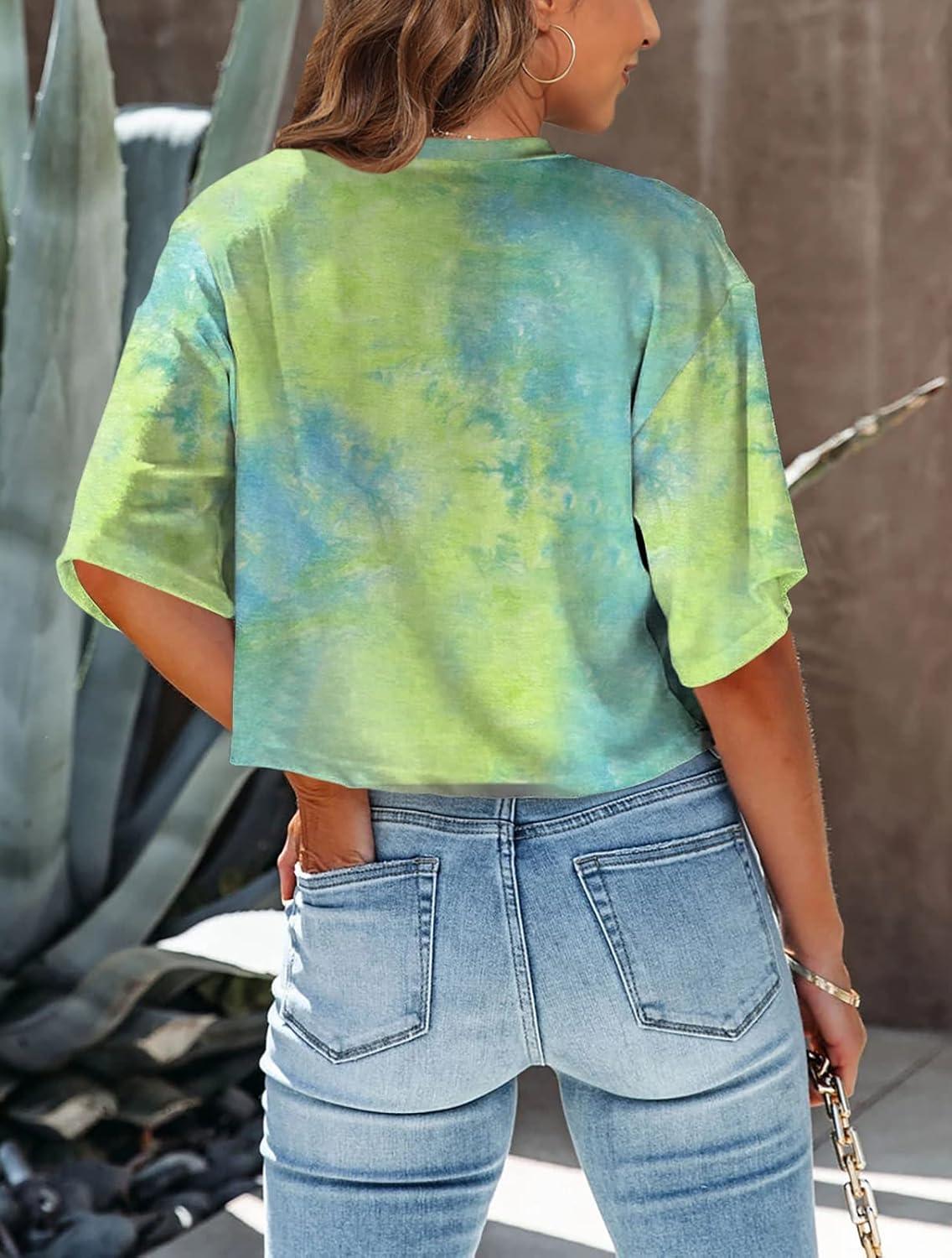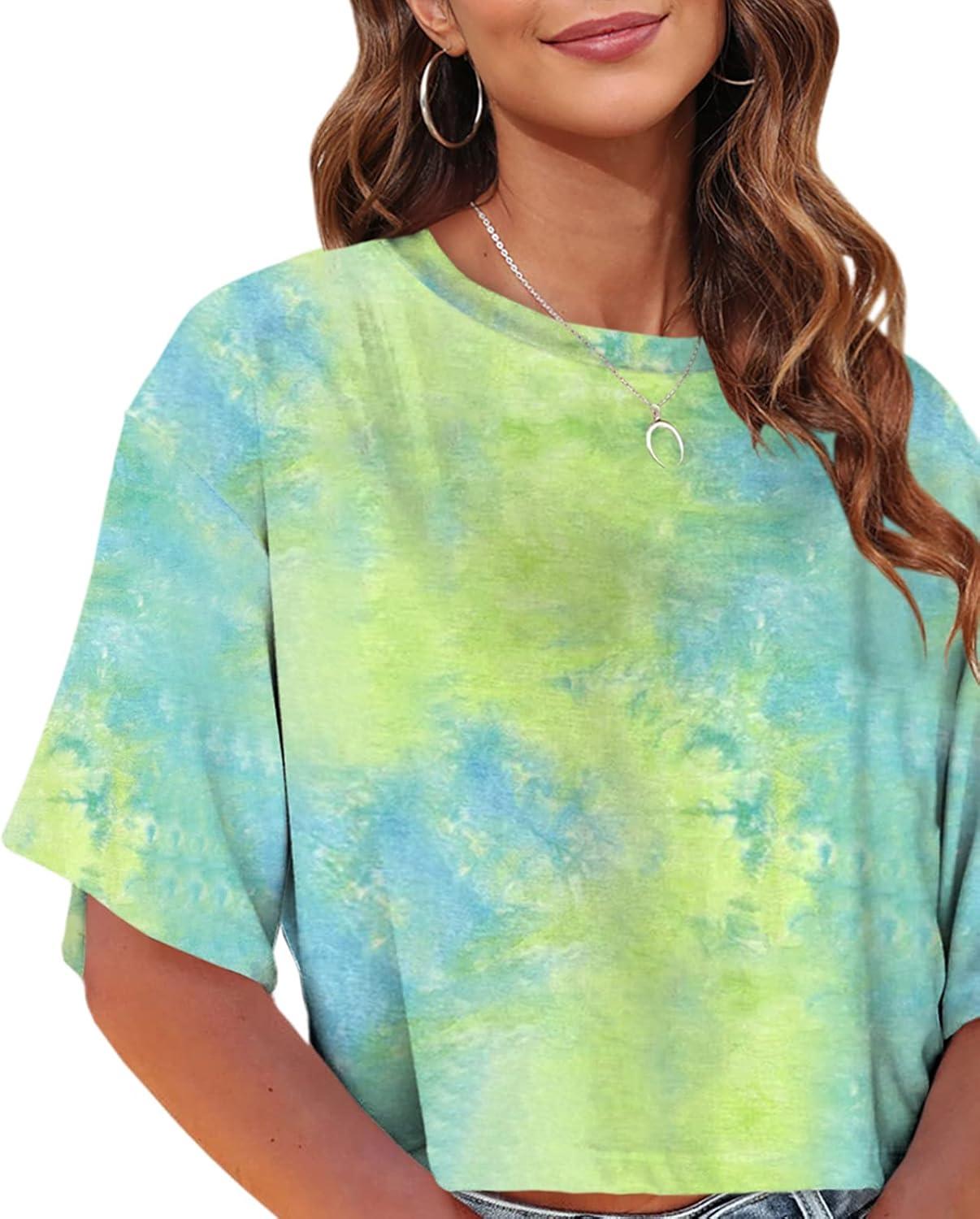Tankaneo Women Half Sleeve Cropped T-Shirts Drop Shoulder Round Neck Crop Tops Casual Summer Solid Color Basic Tees(23-green)