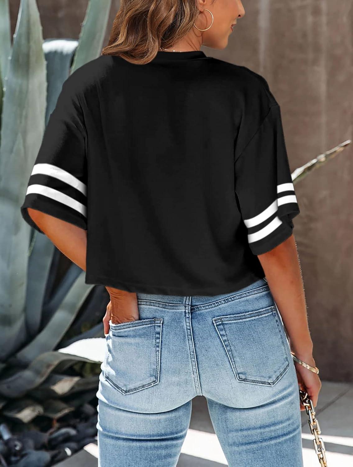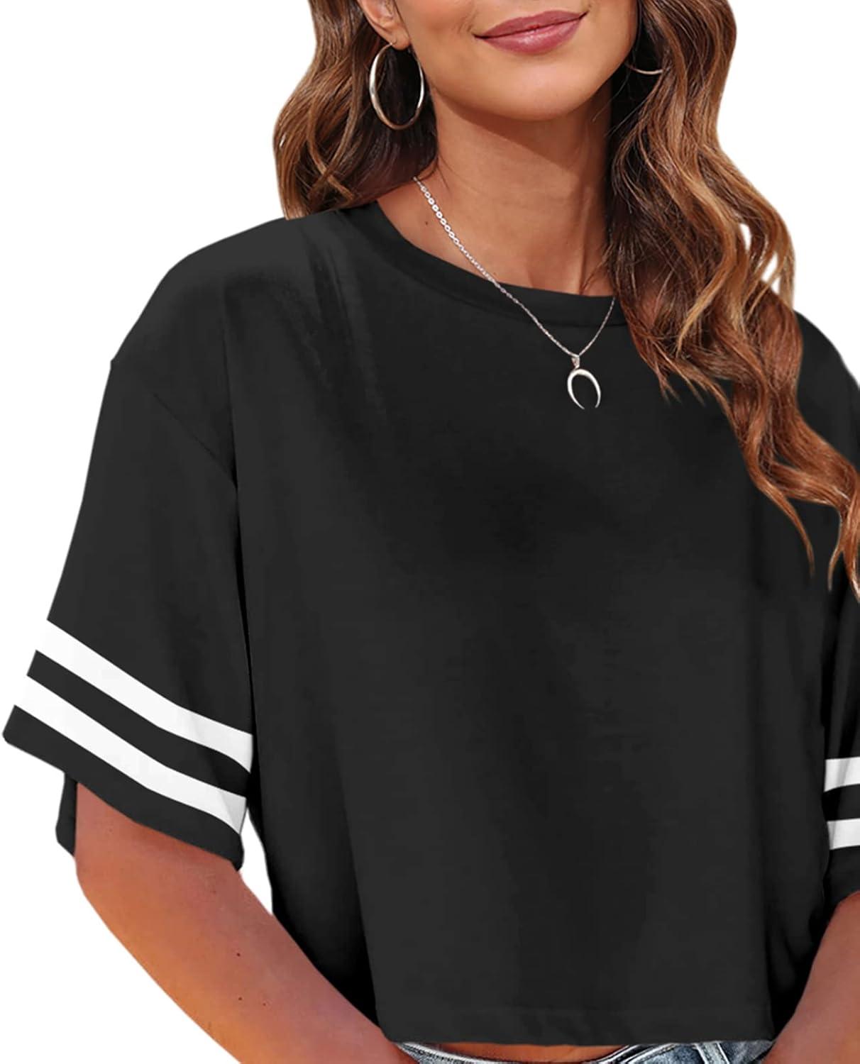 Tankaneo Women Half Sleeve Cropped T-Shirts Drop Shoulder Round Neck Crop Tops Casual Summer Solid Color Basic Tees(Z03-black)