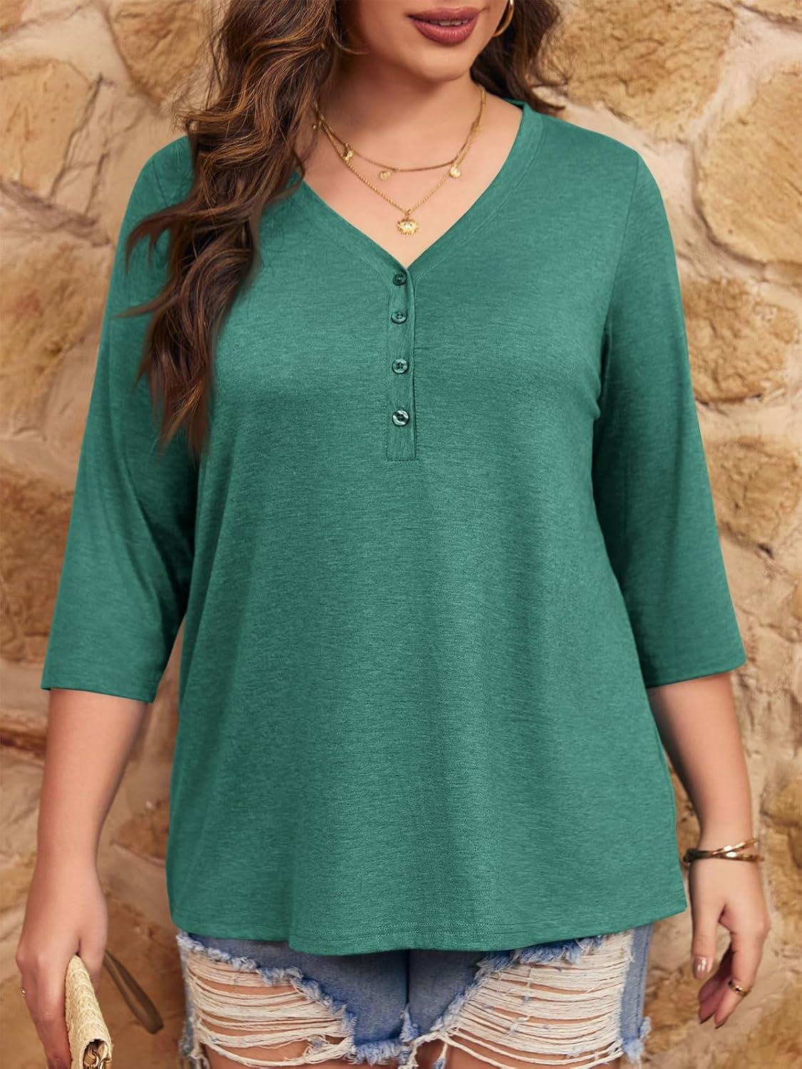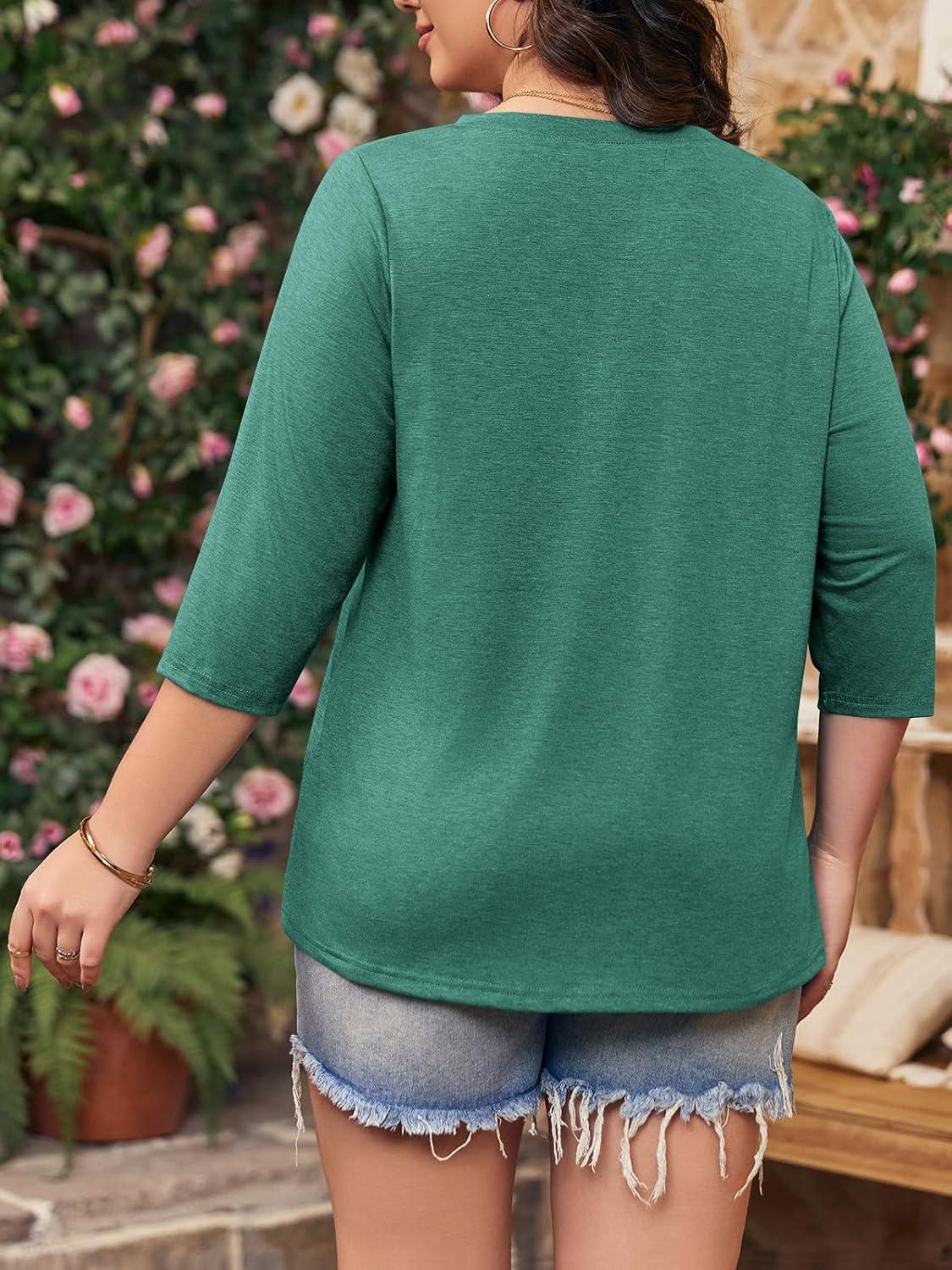 Tankaneo Women Plus Size Tops V Neck 3/4 Sleeve Casual T Shirts Loose Basic Tunic Tees(Green)