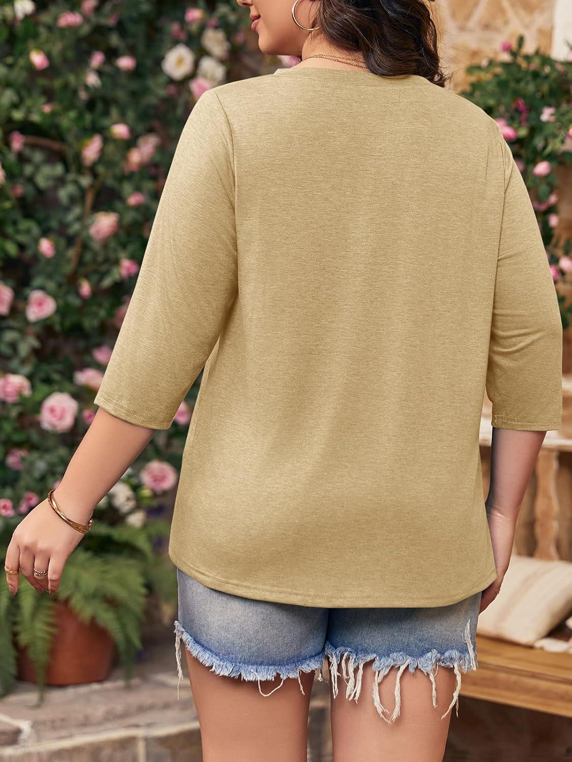 Tankaneo Women Plus Size Tops V Neck 3/4 Sleeve Casual T Shirts Loose Basic Tunic Tees(Khaki)