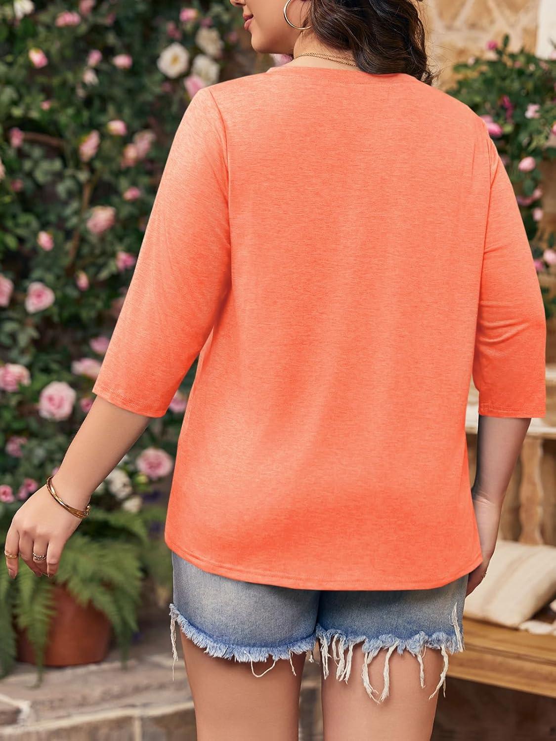 Tankaneo Women Plus Size Tops V Neck 3/4 Sleeve Casual T Shirts Loose Basic Tunic Tees(Orange)