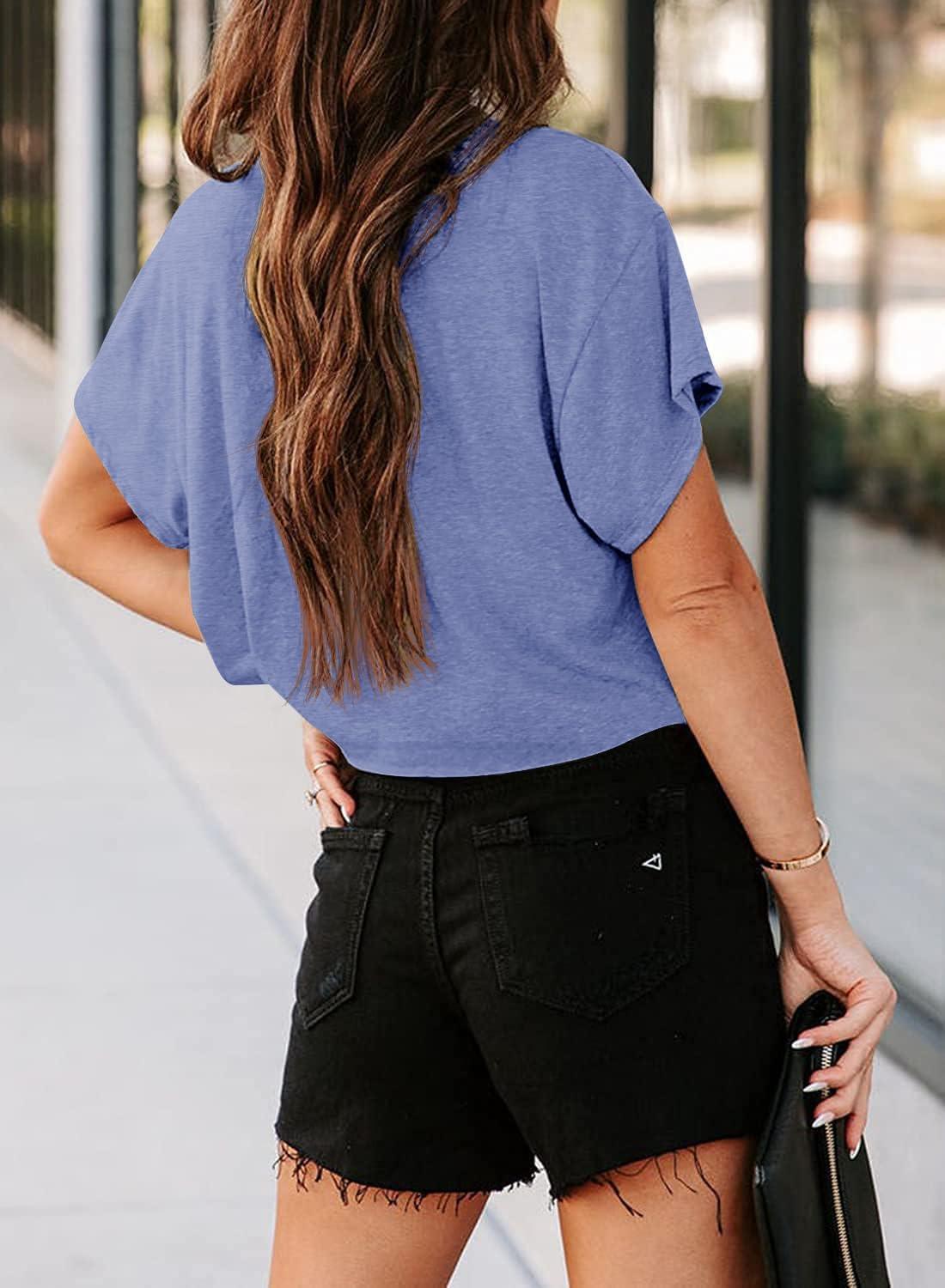 Tankaneo Women Short Sleeve Cropped T-Shirts Crew Neck Loose Crop Tops Summer Casual Drop Shoulder Basic Tees(Light Blue)