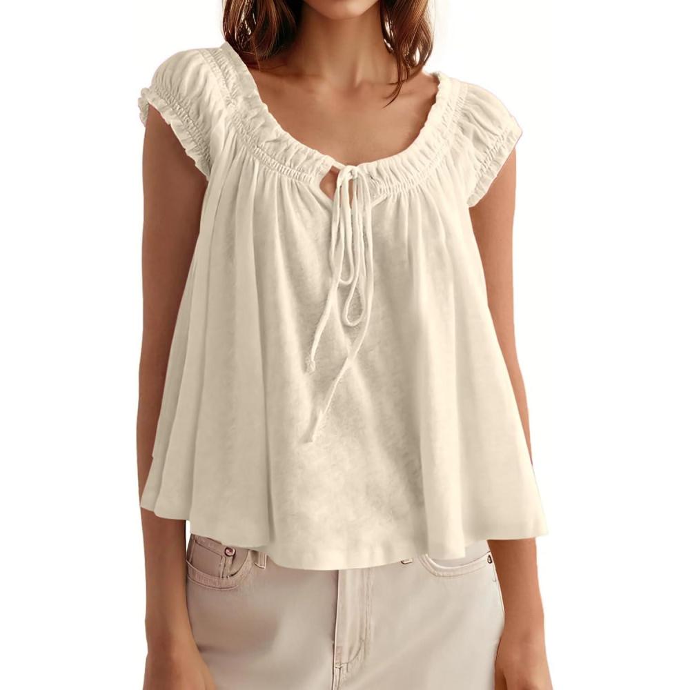 Tankaneo Women Summer Tie Front Tank Tops Cap Sleeve Pleated Babydoll Tops Casual Loose Fit Going Out Flowy Shirt(Beige)