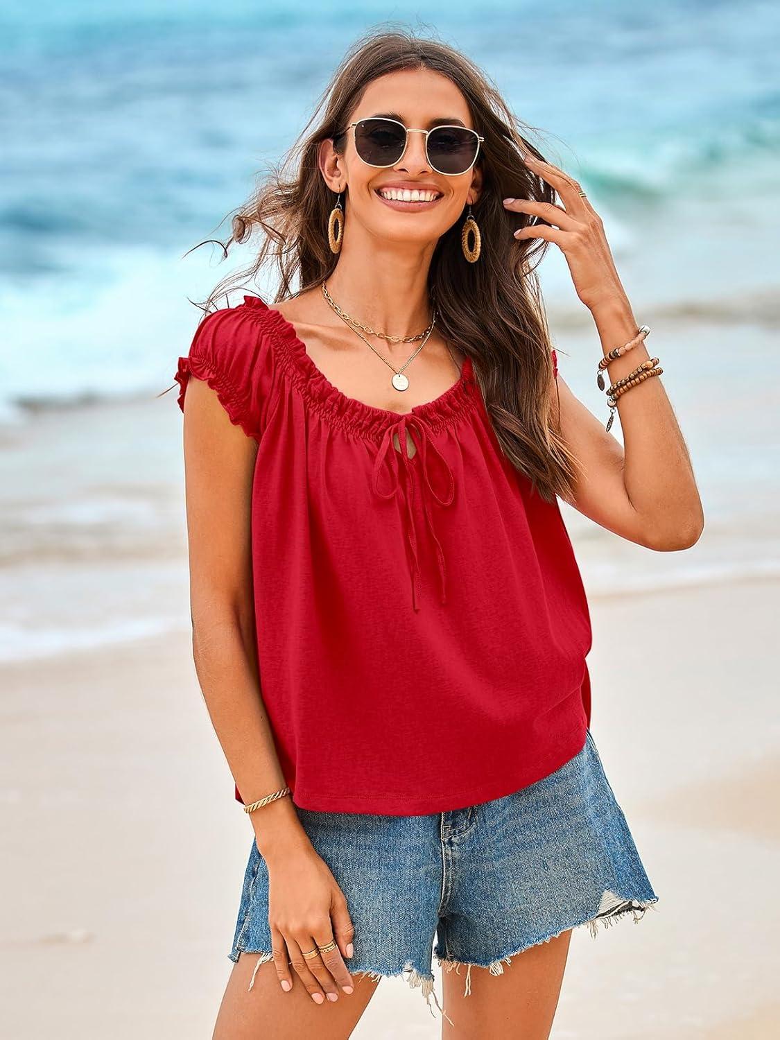 Tankaneo Women Summer Tie Front Tank Tops Cap Sleeve Pleated Babydoll Tops Casual Loose Fit Going Out Flowy Shirt(Red)