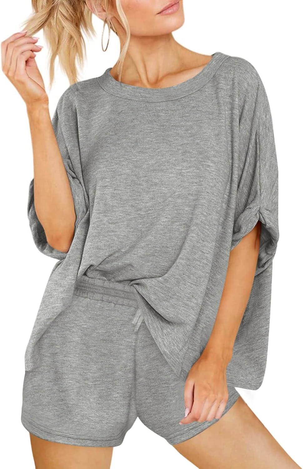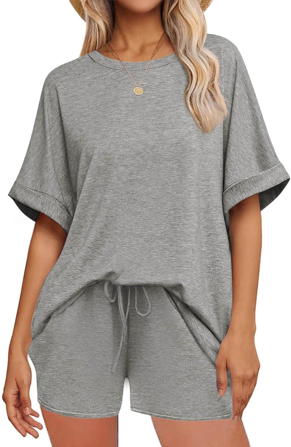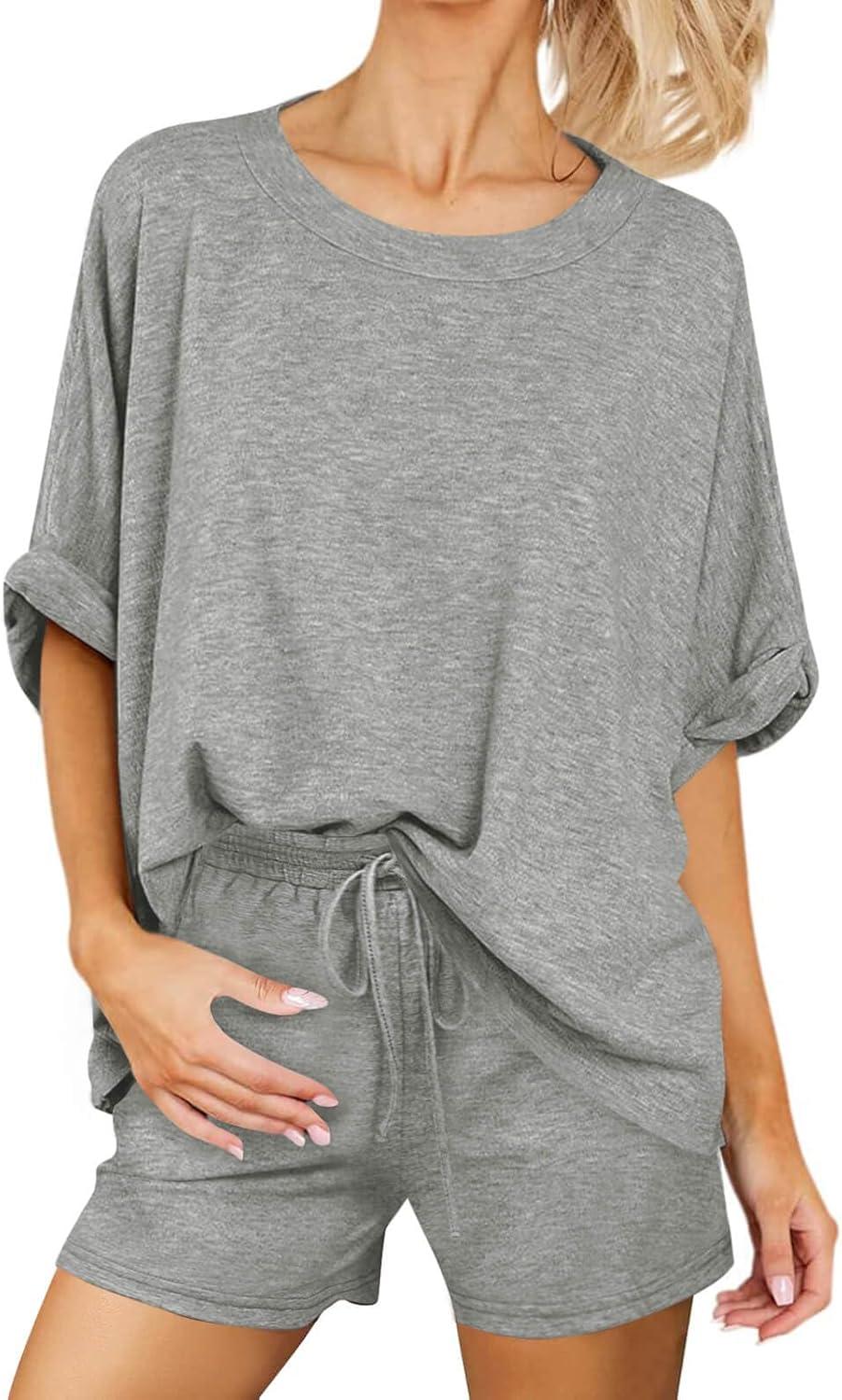Tankaneo Womens 2 Piece Lounge Sets Oversized Short Sleeve T-shirts Drawstring Shorts Pajamas Summer Outfits(Grey)