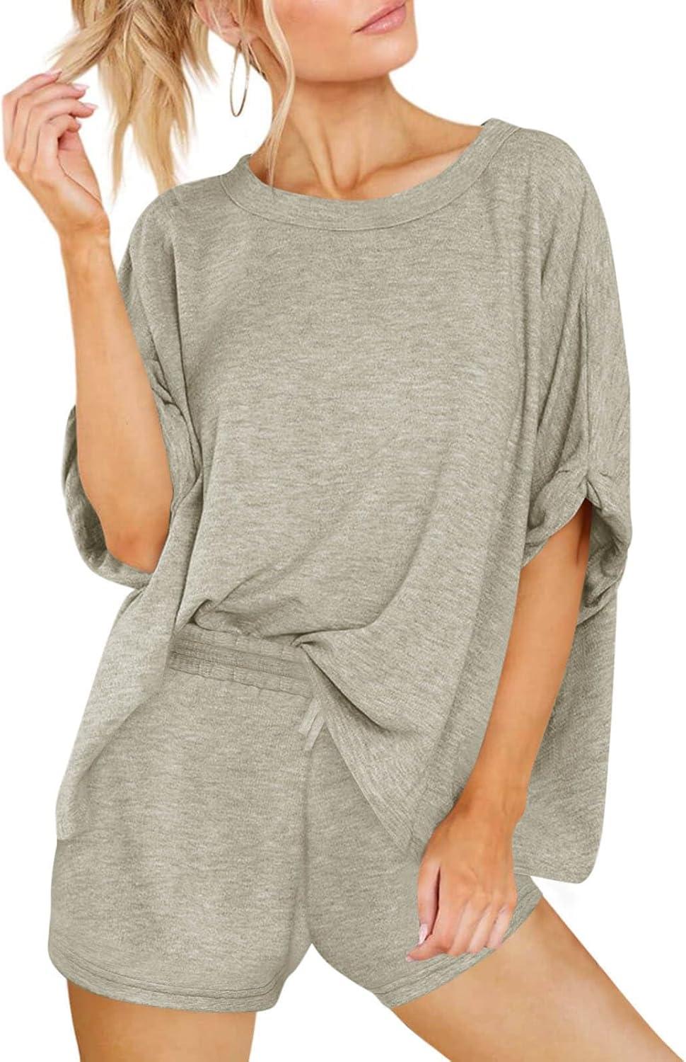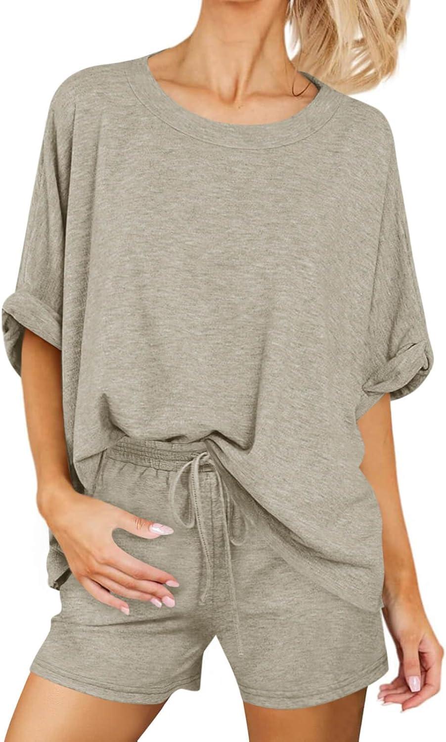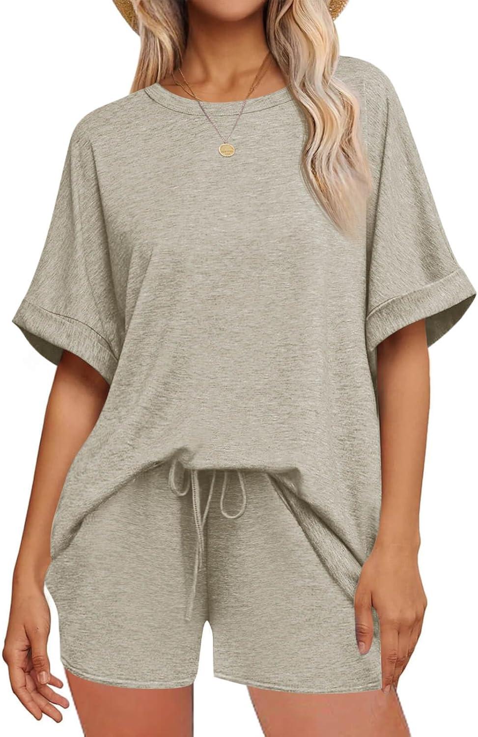 Tankaneo Womens 2 Piece Lounge Sets Oversized Short Sleeve T-shirts Drawstring Shorts Pajamas Summer Outfits(Light Brown)