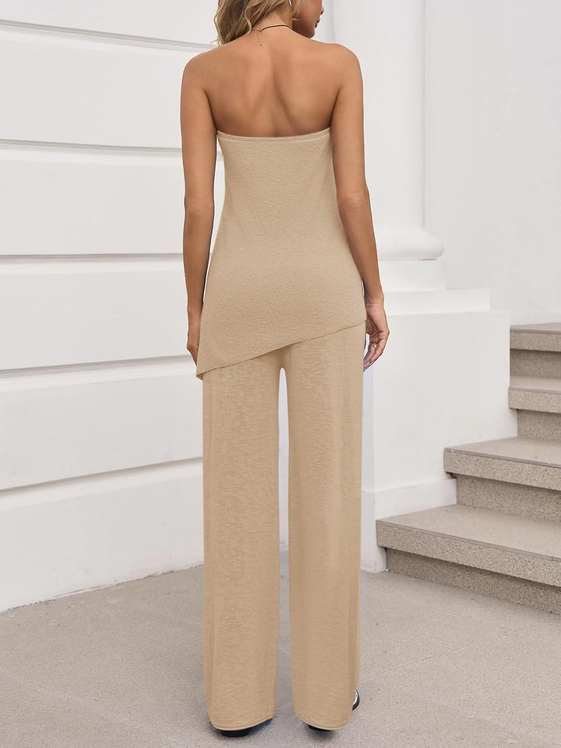 Tankaneo Womens 2 Piece Outfits Asymmetrical Tube Top Wide Leg Pants Knit Vacation Travel 2025 Matching Lounge Sets(Apricot)