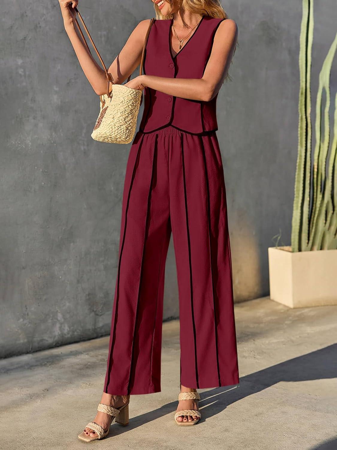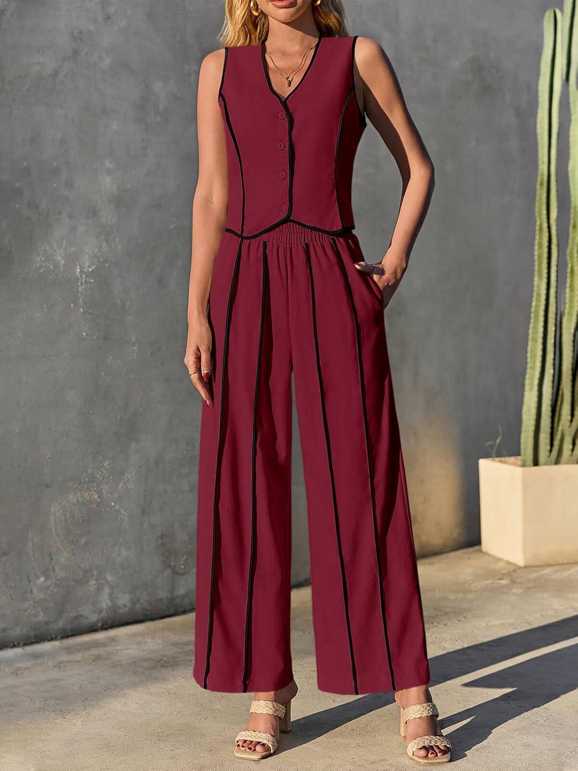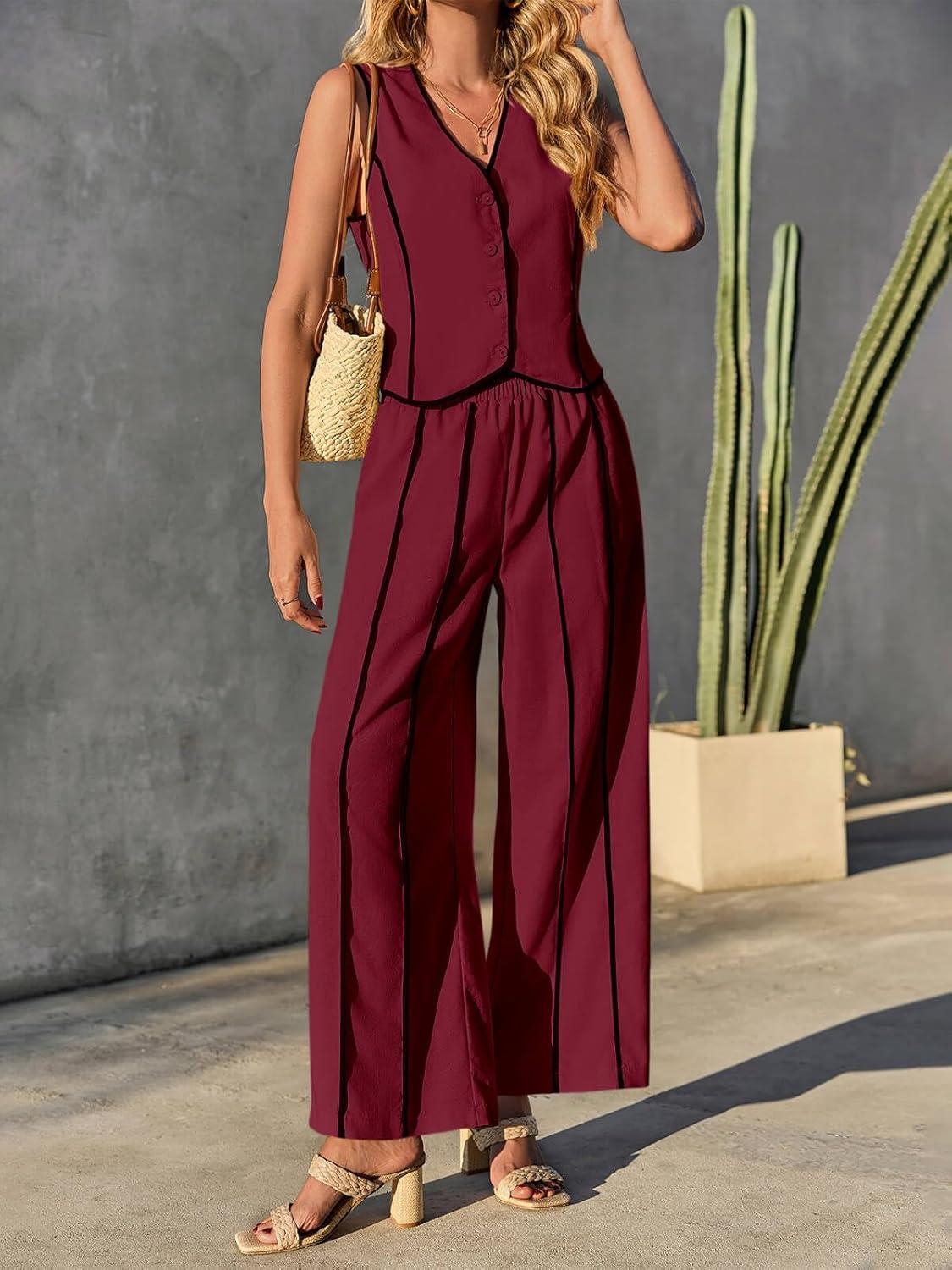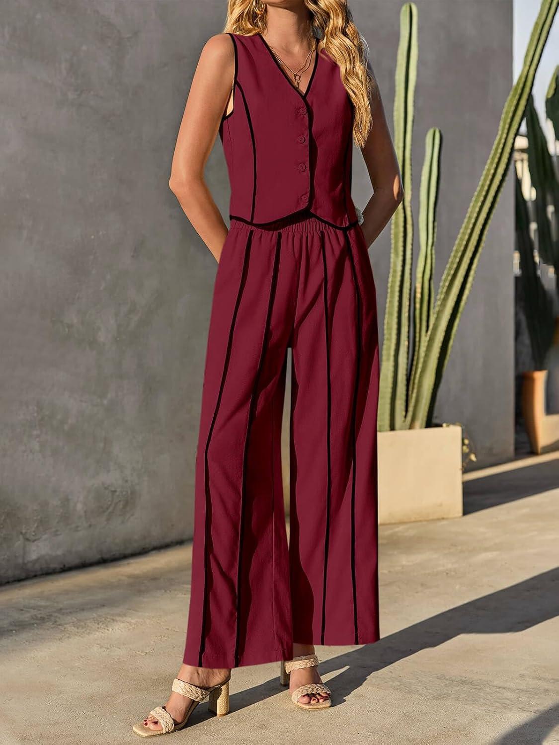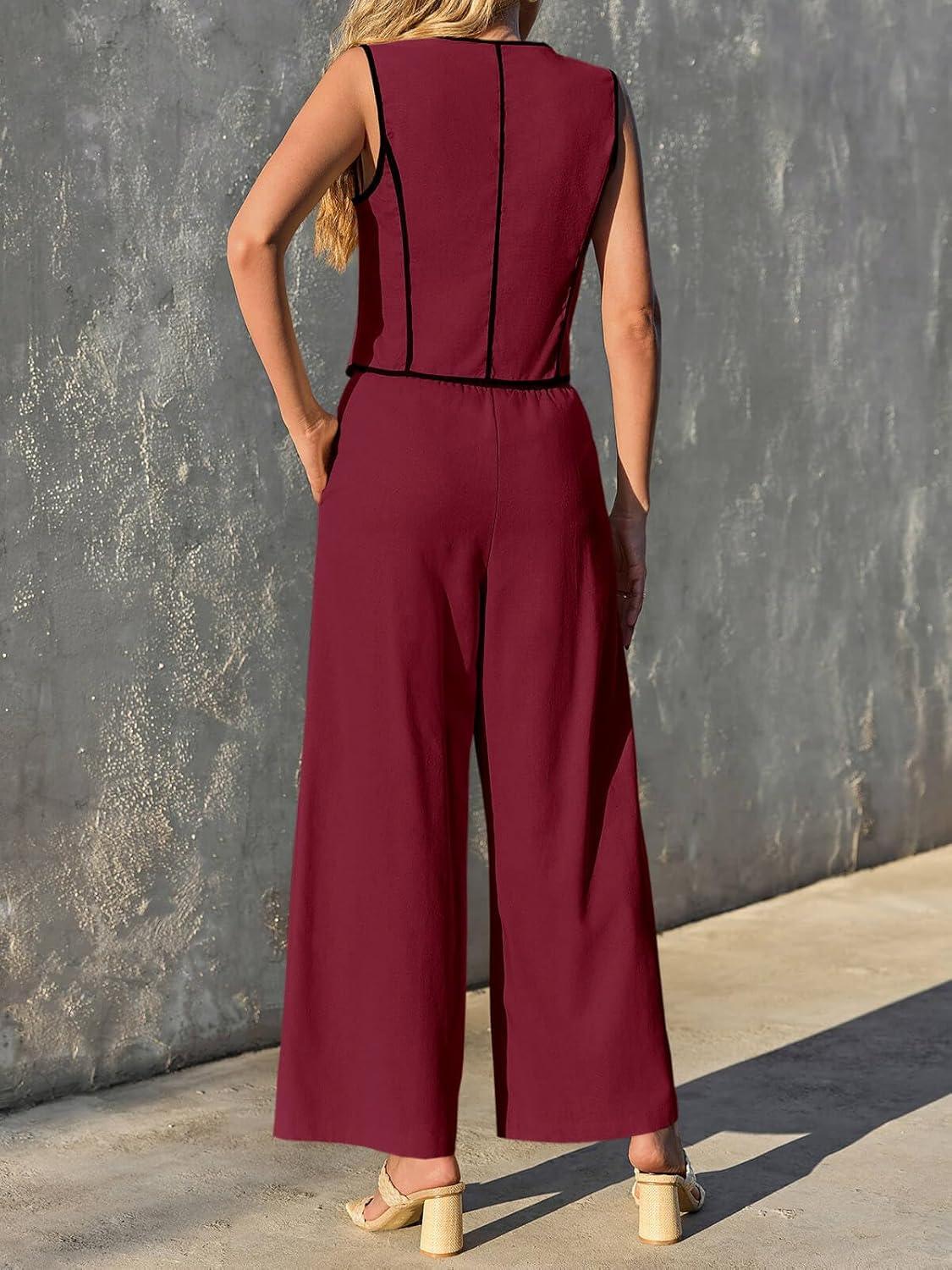 Tankaneo Womens 2 Piece Outfits Linen Sets Sleeveless Button Vest Wide Leg Pants Matching Lounge Set(Burgundy)