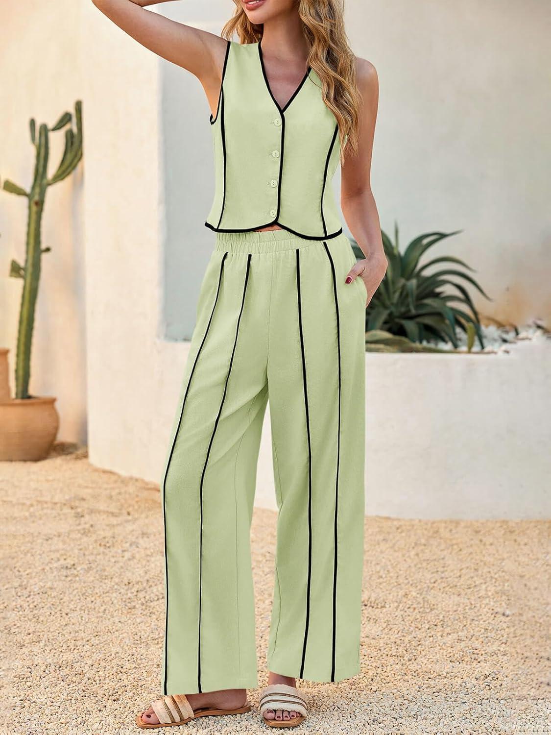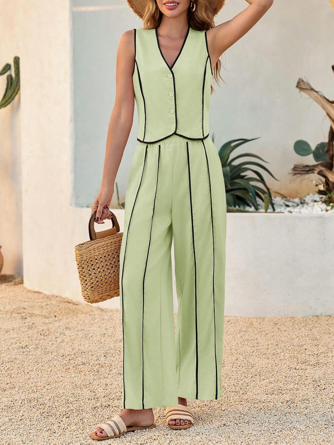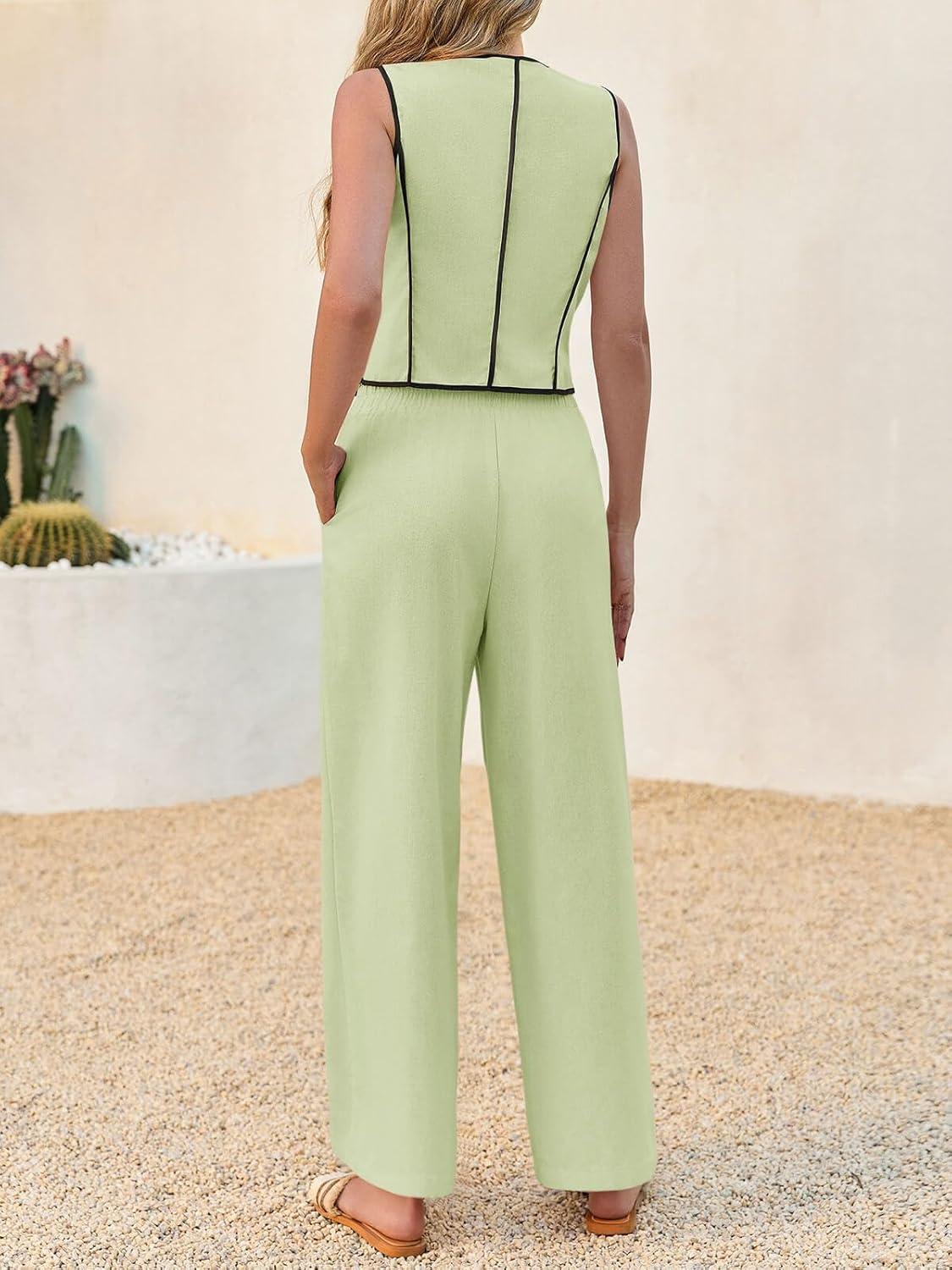 Tankaneo Womens 2 Piece Outfits Linen Sets Sleeveless Button Vest Wide Leg Pants Matching Lounge Set(Fluorescent Green)