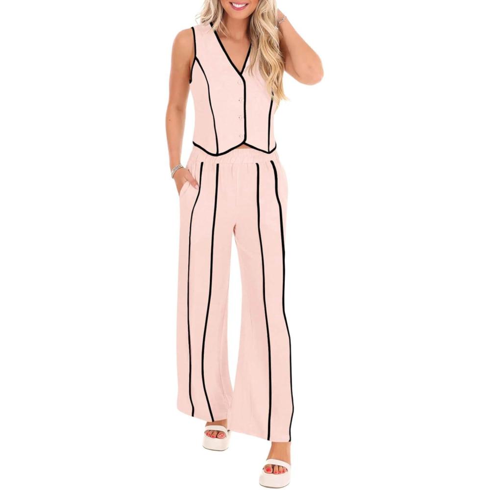 Tankaneo Womens 2 Piece Outfits Linen Sets Sleeveless Button Vest Wide Leg Pants Matching Lounge Set(Light Pink)