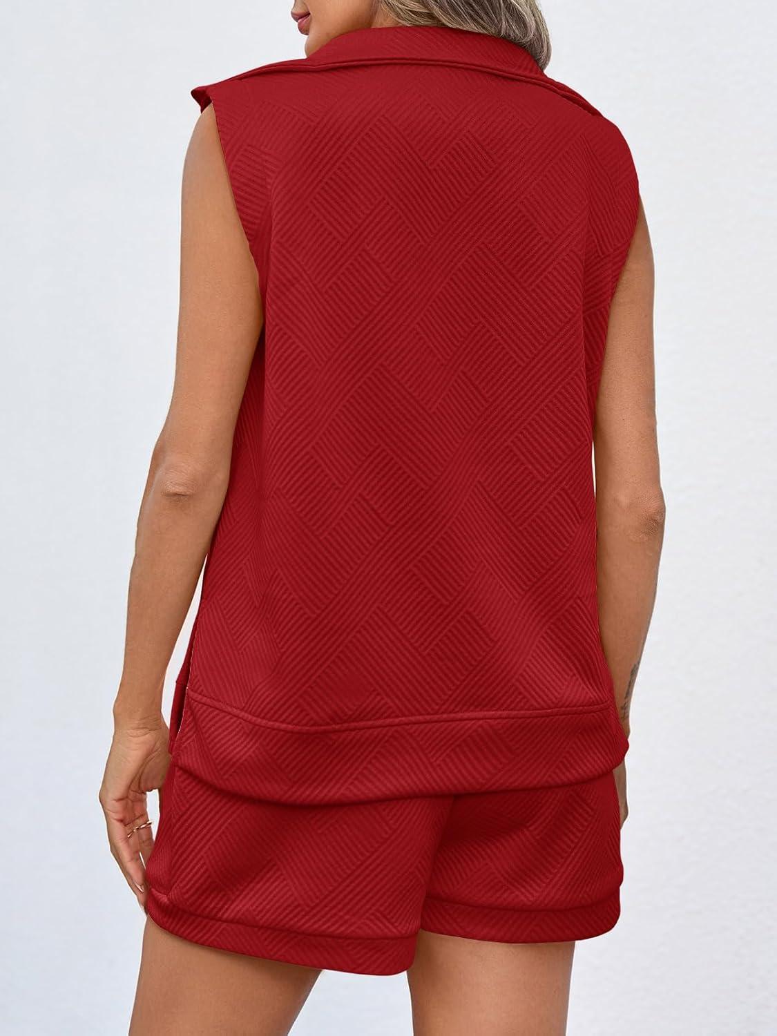 Tankaneo Womens 2 Piece Outfits Short Sets Half Zip Sleeveless Tops and Drawstring Shorts Loungewear Sweatsuit Set(Burgundy)