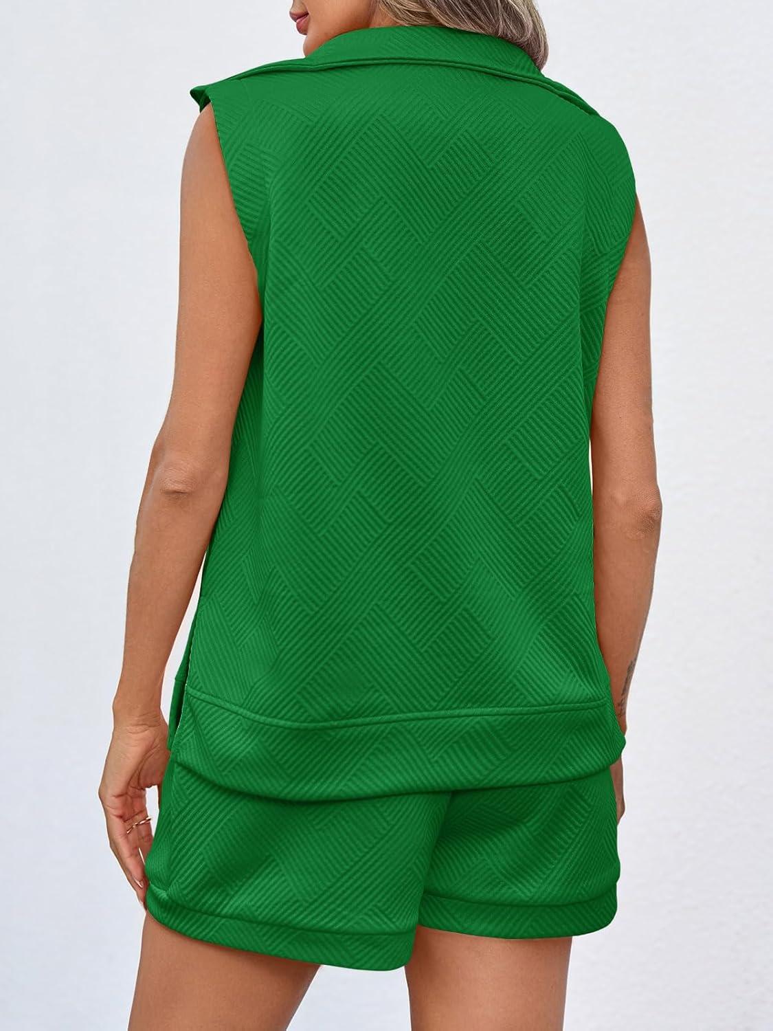 Tankaneo Womens 2 Piece Outfits Short Sets Half Zip Sleeveless Tops and Drawstring Shorts Loungewear Sweatsuit Set(Green)