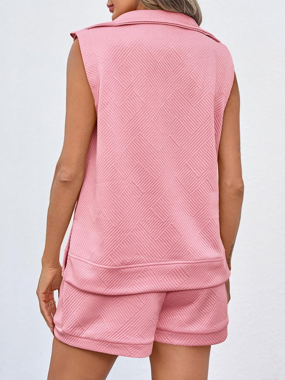 Tankaneo Womens 2 Piece Outfits Short Sets Half Zip Sleeveless Tops and Drawstring Shorts Loungewear Sweatsuit Set(Pink)