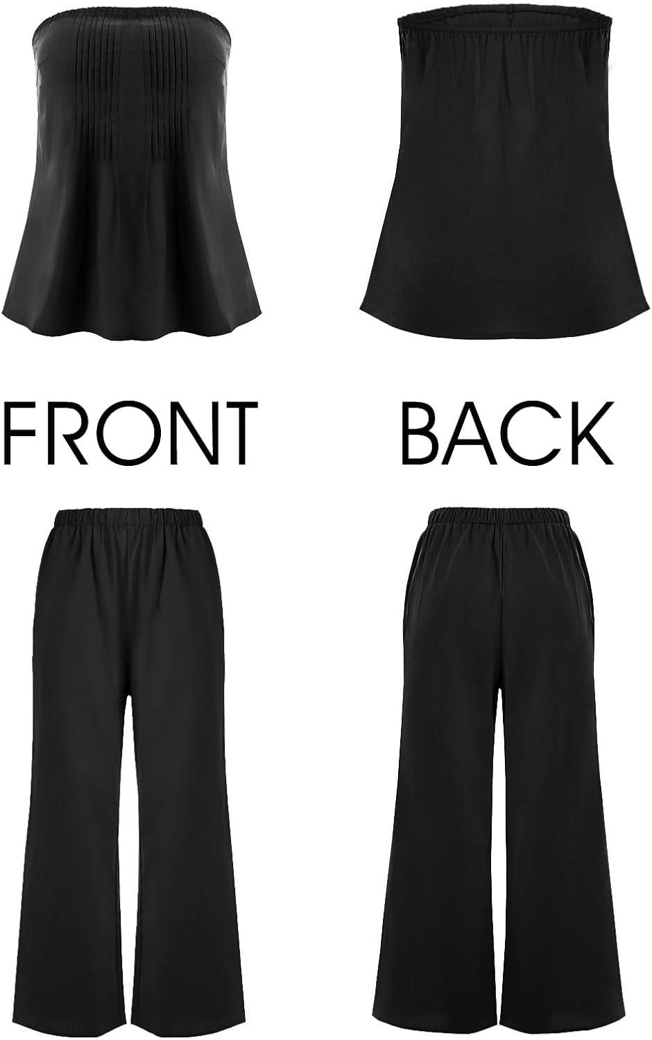 Tankaneo Womens 2 Piece Outfits Summer Strapless Tube Tops Wide Leg Pants Cotton Vacation Pleated Matching Lounge Set(Black)