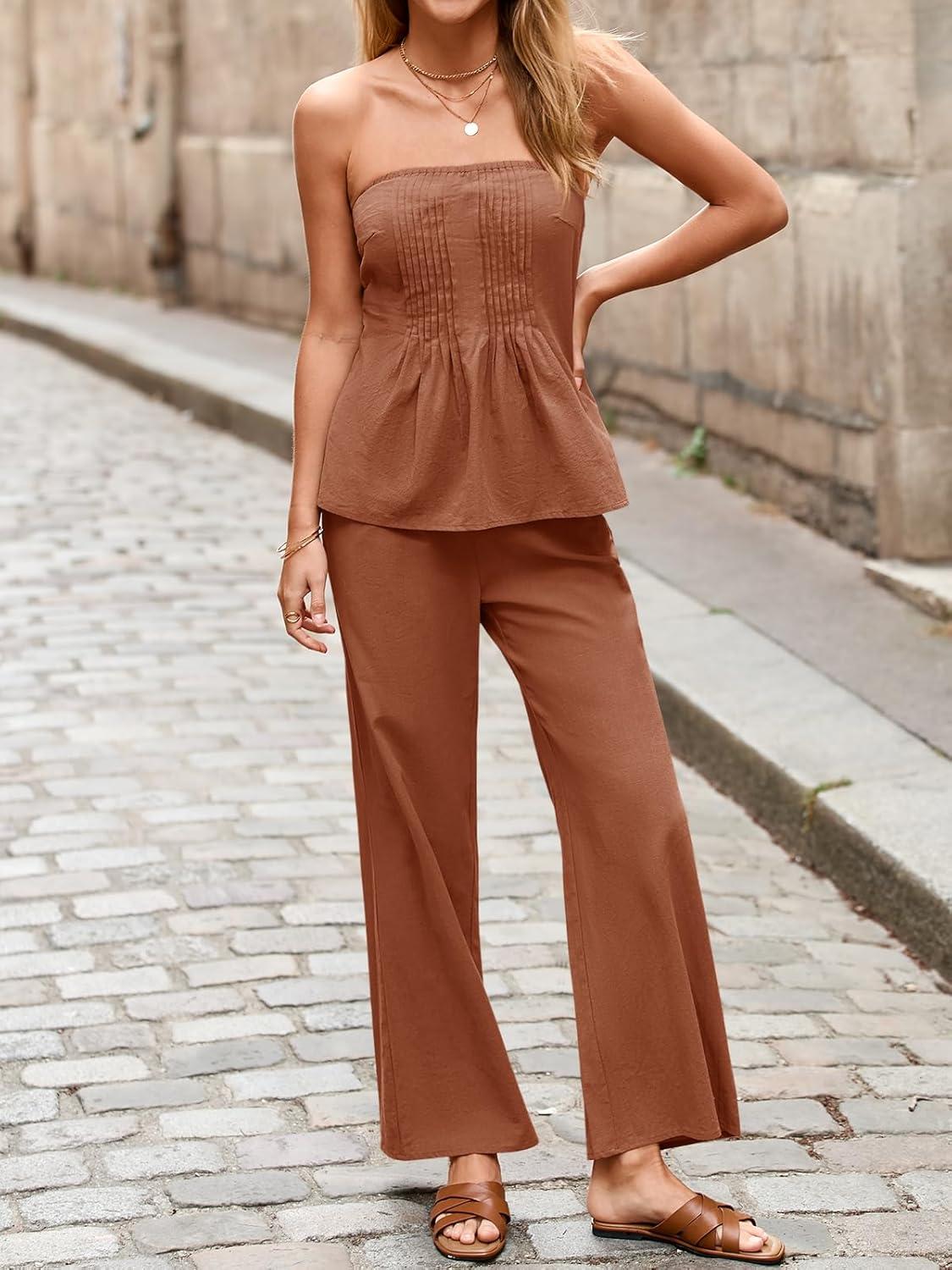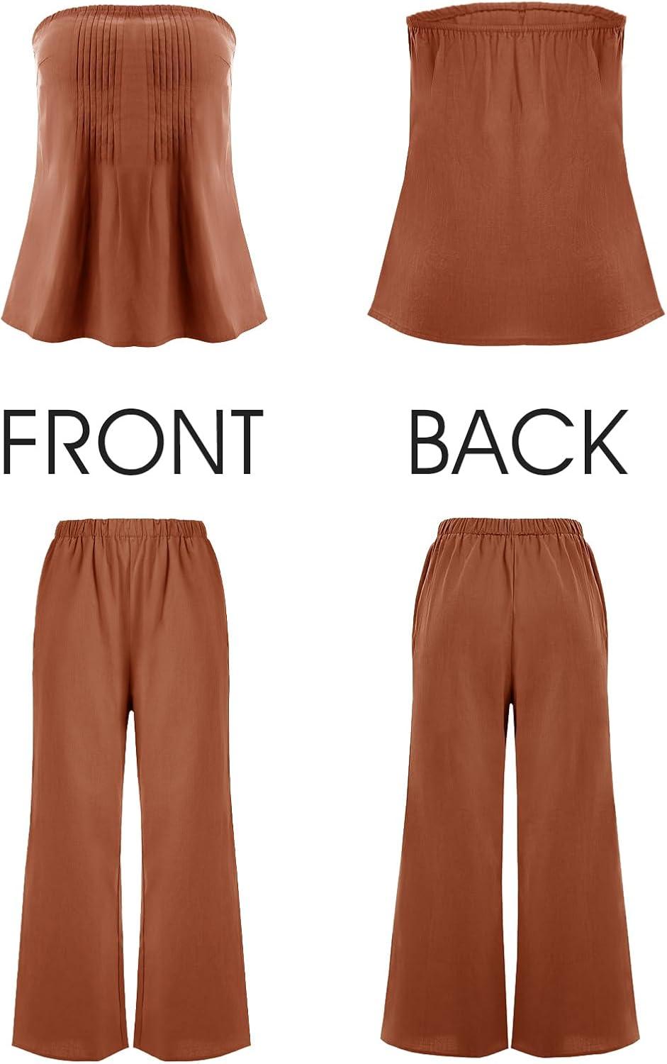 Tankaneo Womens 2 Piece Outfits Summer Strapless Tube Tops Wide Leg Pants Cotton Vacation Pleated Matching Lounge Set(Brick Red)