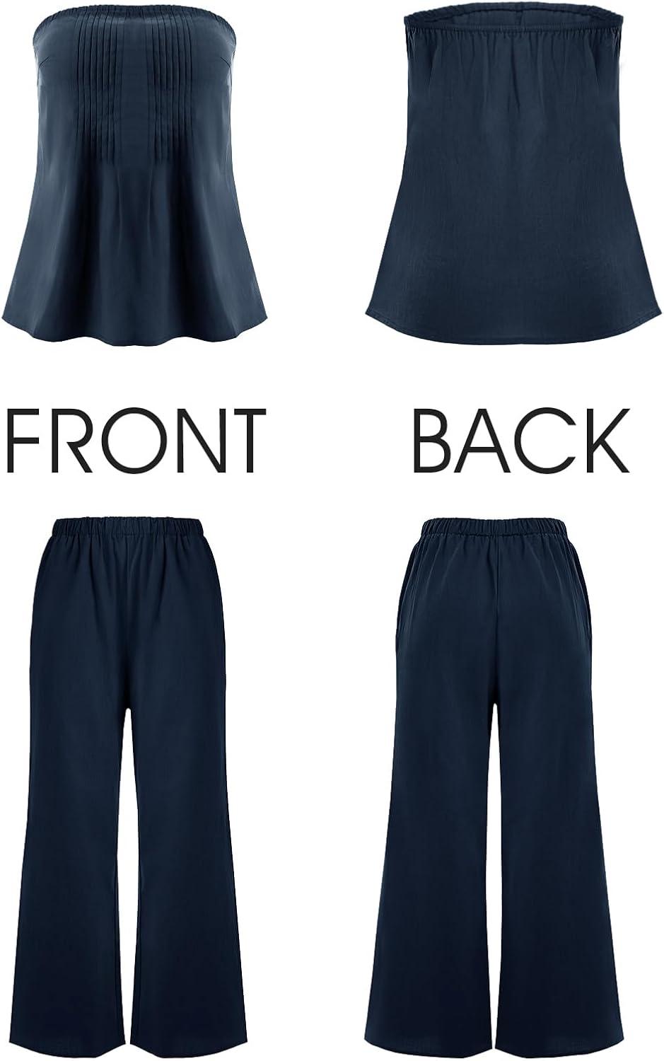 Tankaneo Womens 2 Piece Outfits Summer Strapless Tube Tops Wide Leg Pants Cotton Vacation Pleated Matching Lounge Set(Navy)