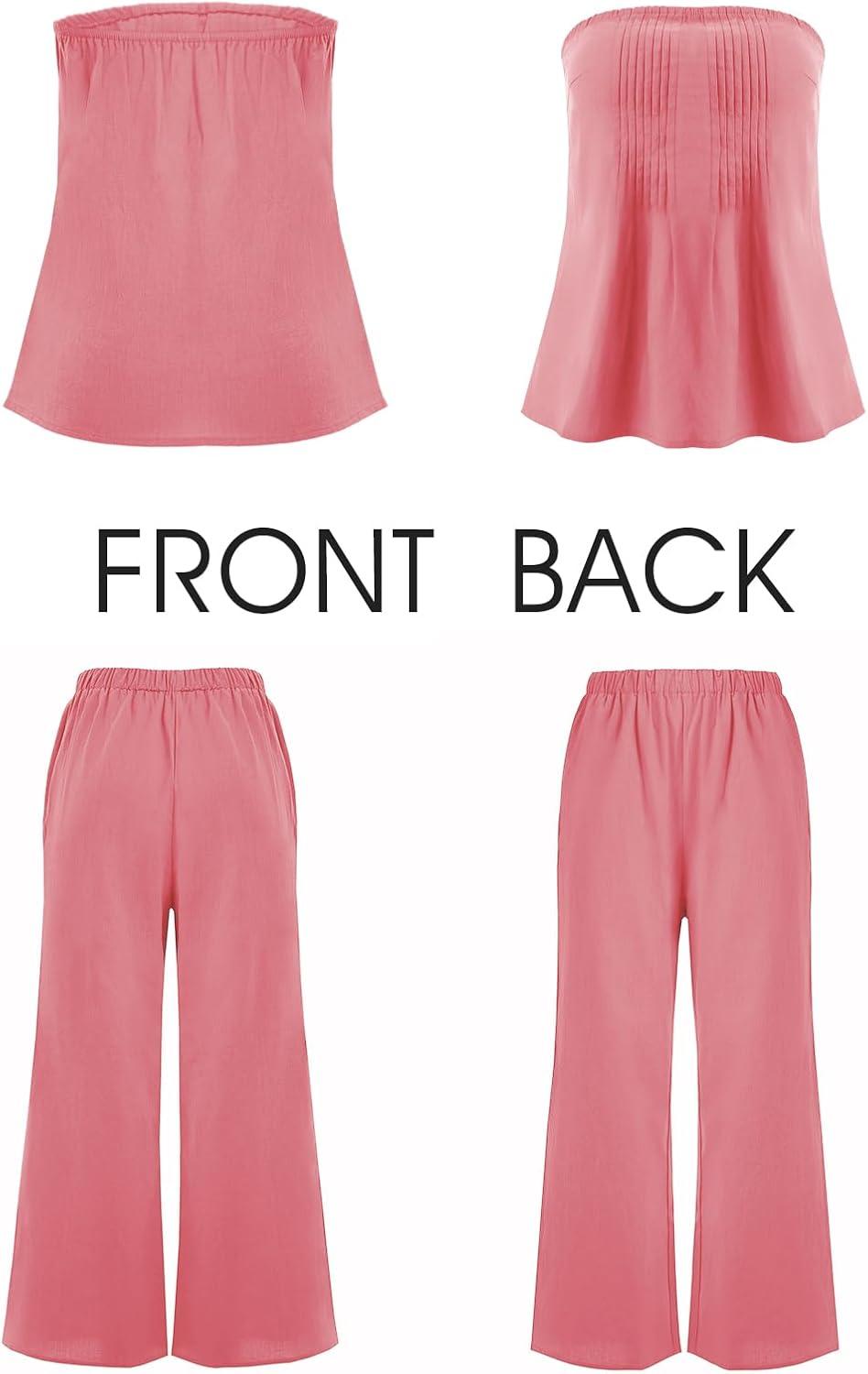 Tankaneo Womens 2 Piece Outfits Summer Strapless Tube Tops Wide Leg Pants Cotton Vacation Pleated Matching Lounge Set(Pink)