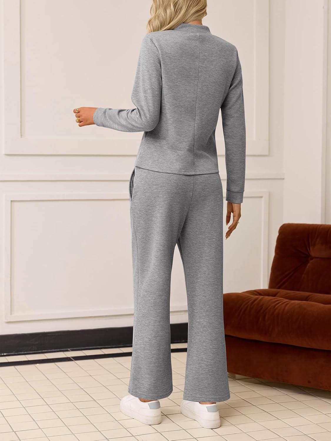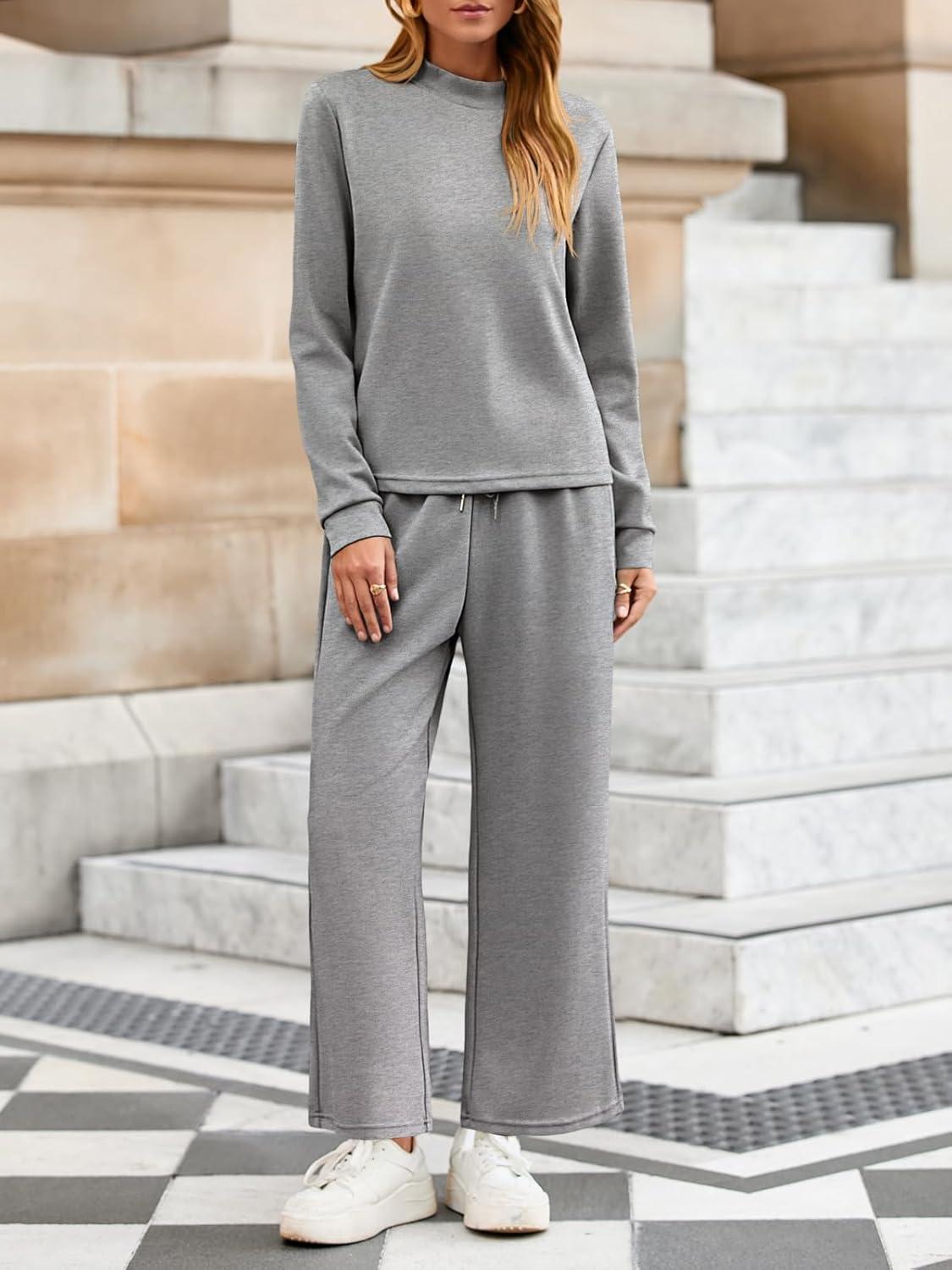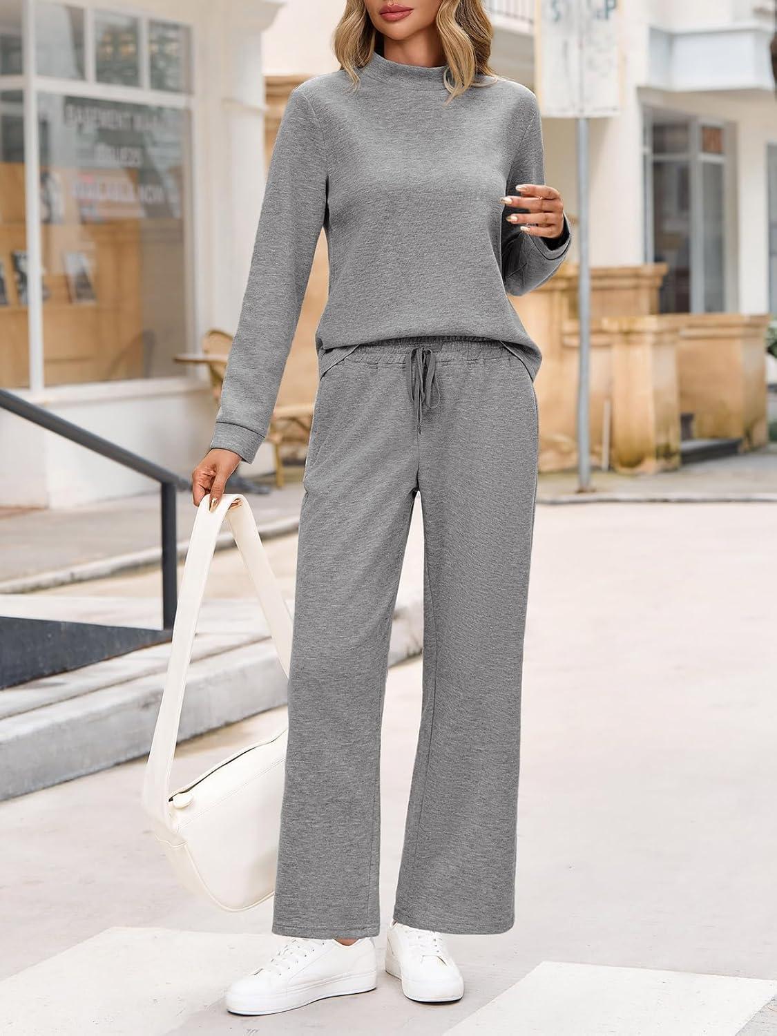 Tankaneo Womens 2 Piece Sets Mock Neck Long Sleeve Tops Wide Leg Pants Lounge Set Vacation Travel Fall Outfits Tracksuit(Grey)