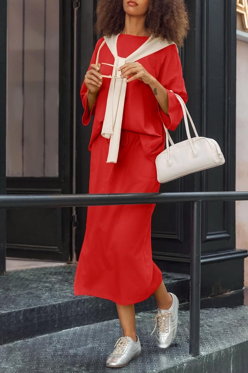 Tankaneo Womens 2 Piece Skirt Sets Oversized 3/4 Sleeve Top and Maxi Skirt Fall Matching Outfits Travel Vacation Set(Red)