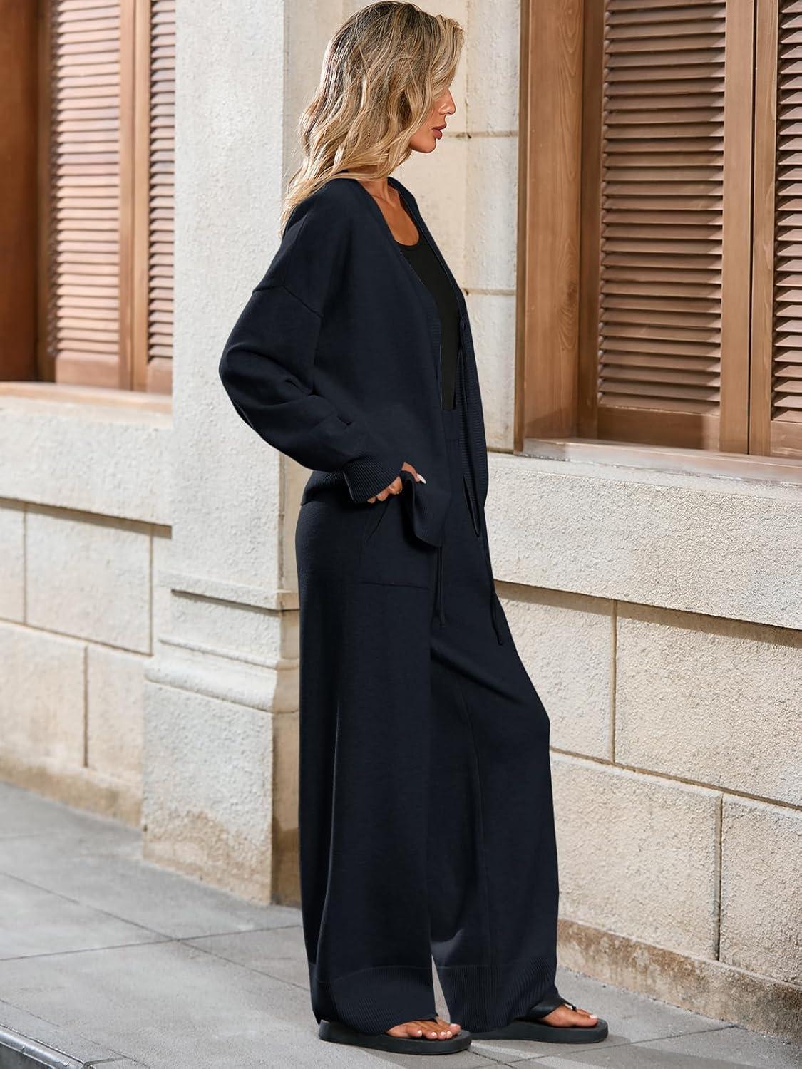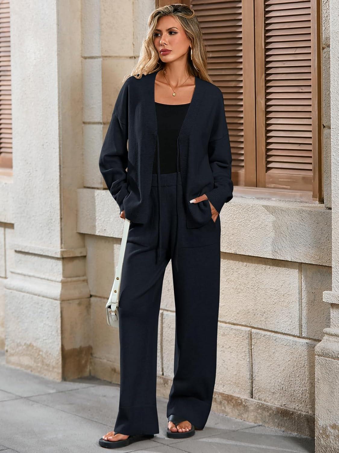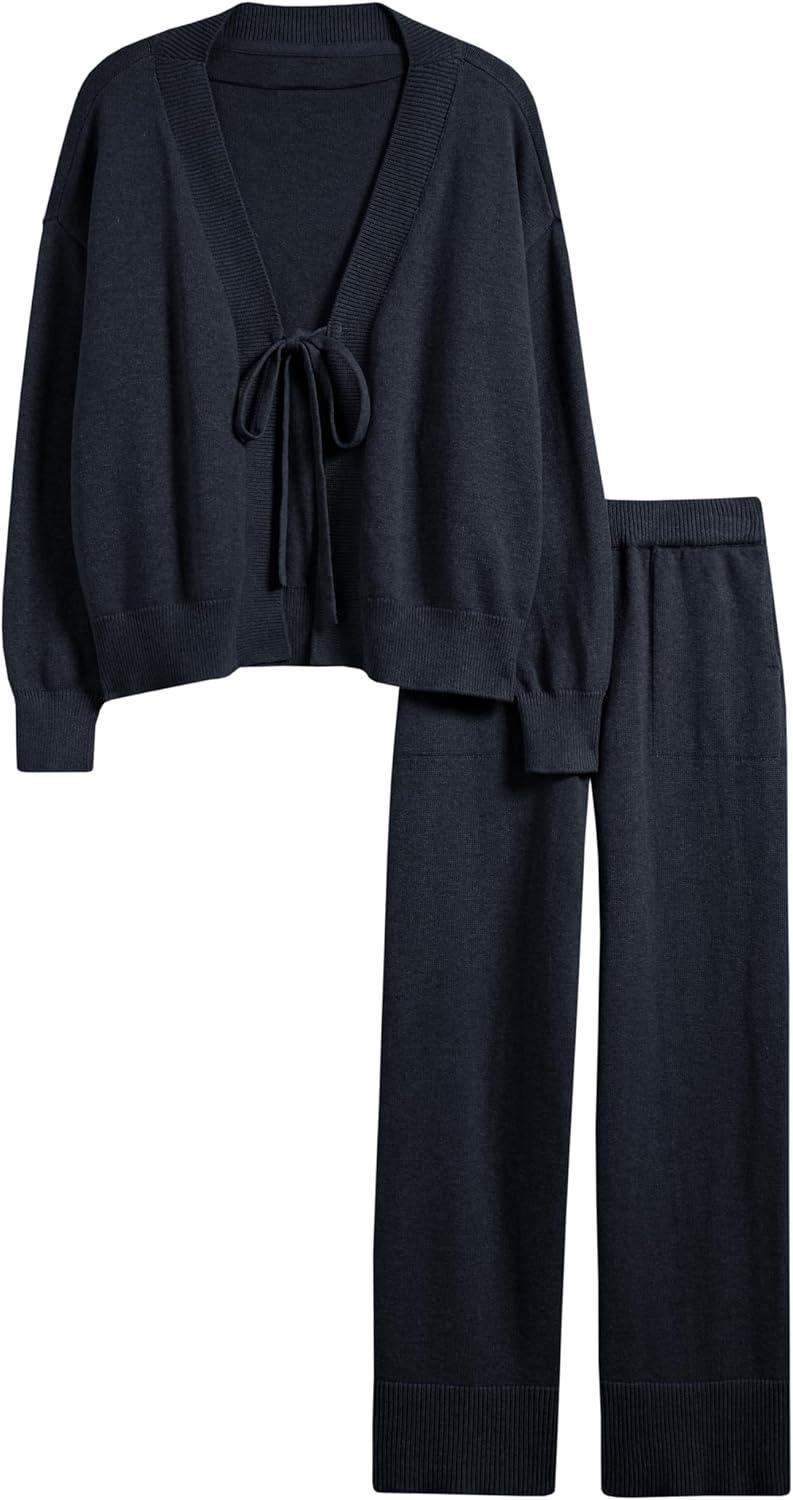 Tankaneo Womens 2 Piece Sweater Sets Oversized Tie Front Cardigan Elastic Waist Pants 2025 Matching Loungewear(Navy)