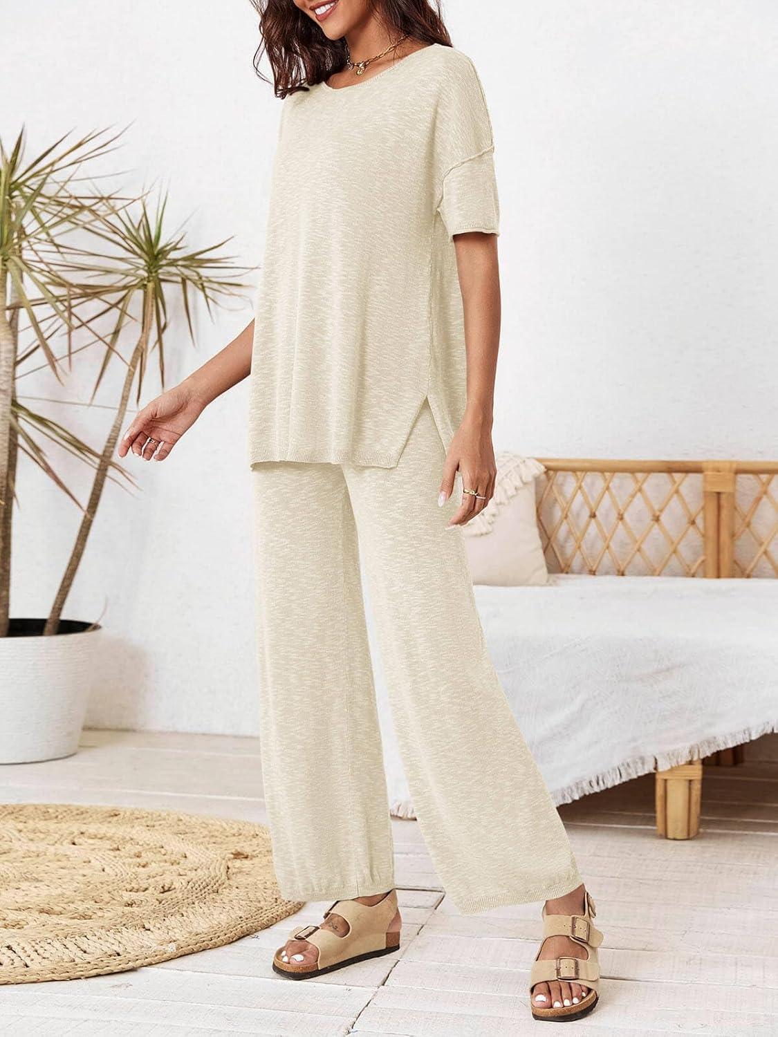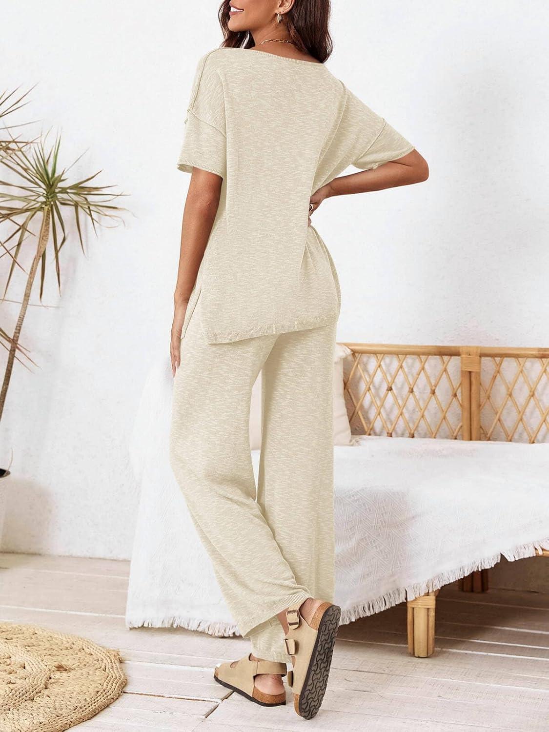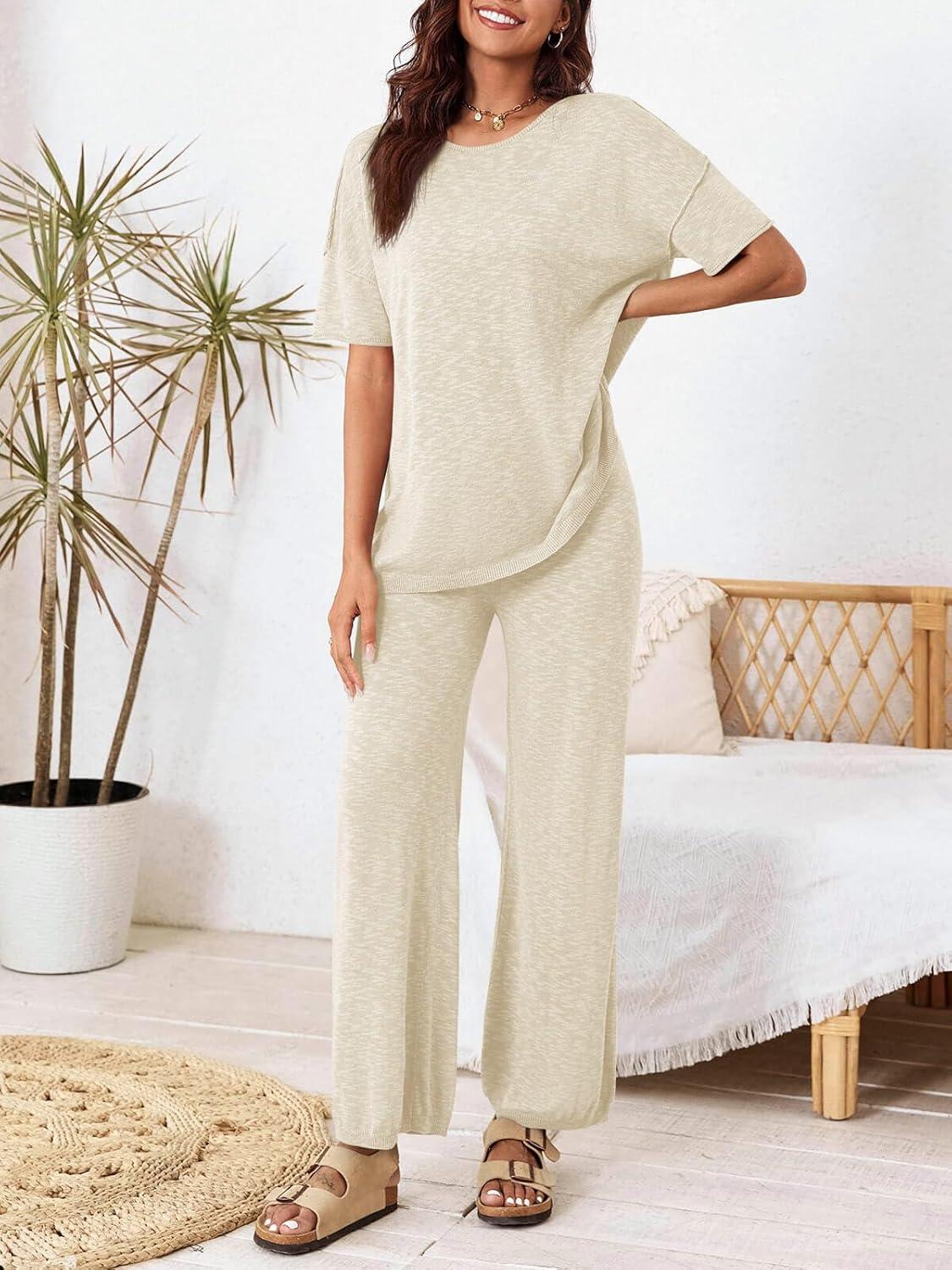Tankaneo Women’s 2 Piece Travel Outfits Casual Short Sleeve Knit Sweater Set Wide Leg Pants Lounge Sets Tracksuit(Beige)