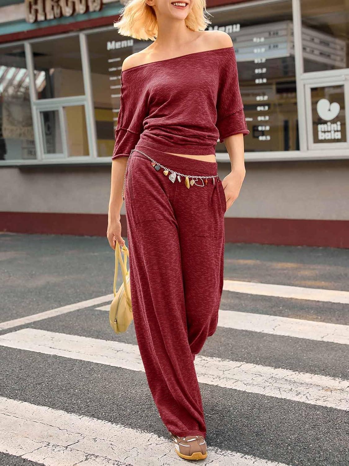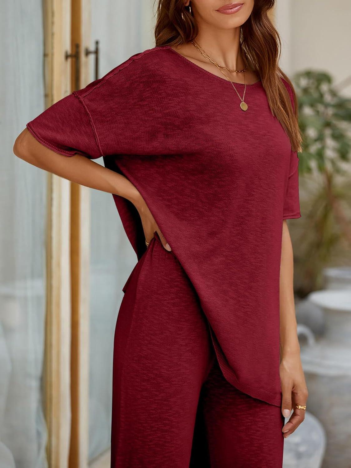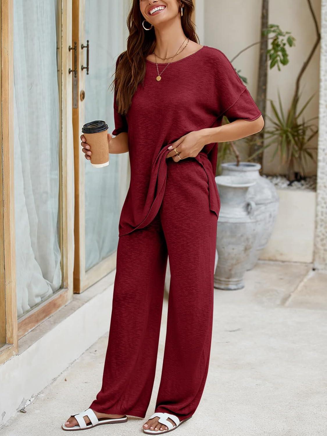 Tankaneo Women’s 2 Piece Travel Outfits Casual Short Sleeve Knit Sweater Set Wide Leg Pants Lounge Sets Tracksuit(Burgundy)