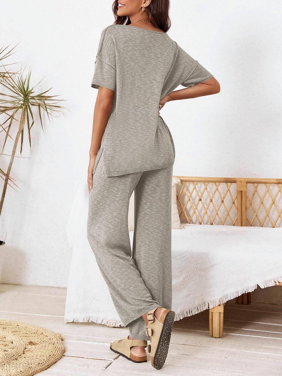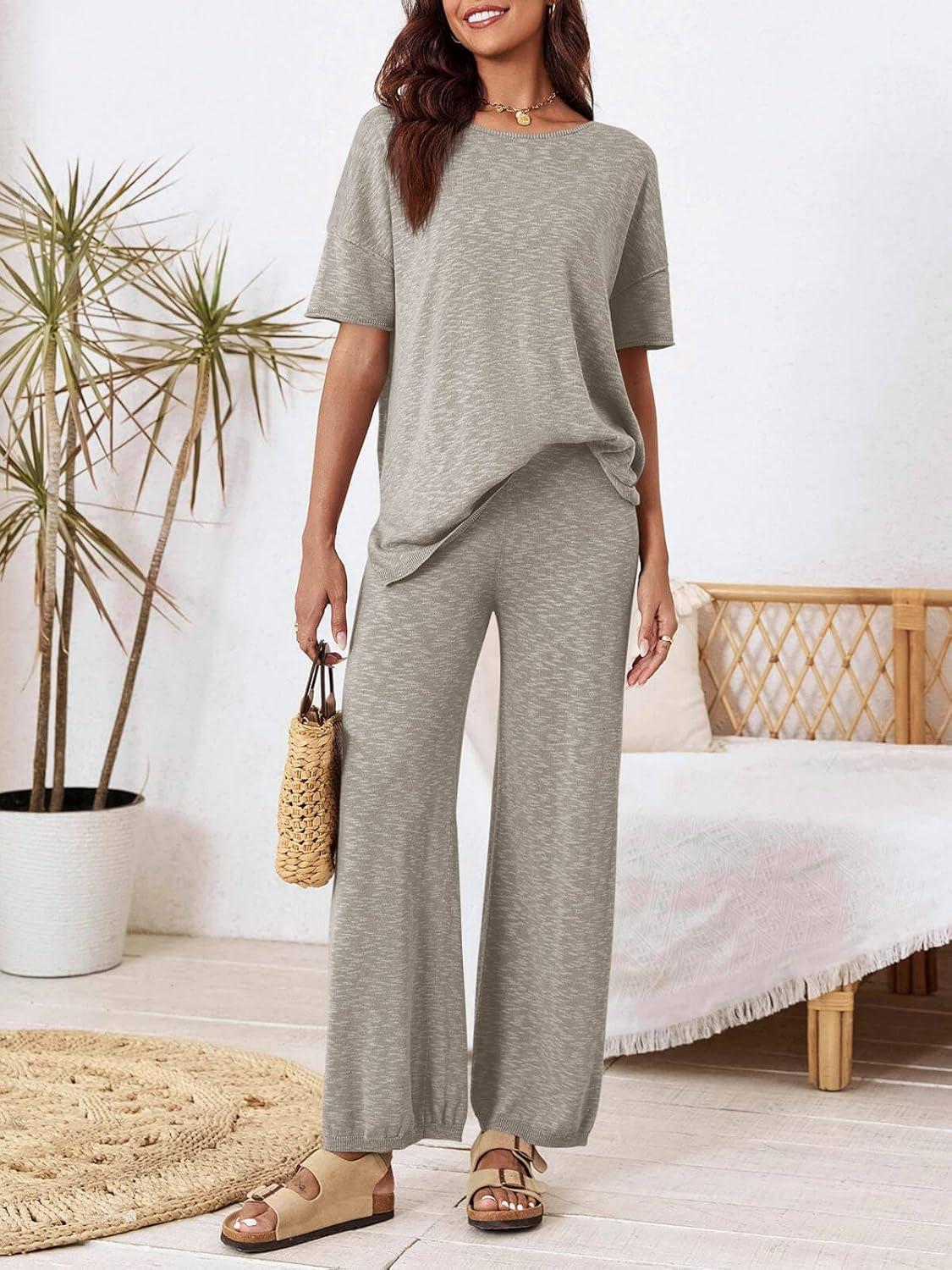 Tankaneo Women’s 2 Piece Travel Outfits Casual Short Sleeve Knit Sweater Set Wide Leg Pants Lounge Sets Tracksuit(Khaki)
