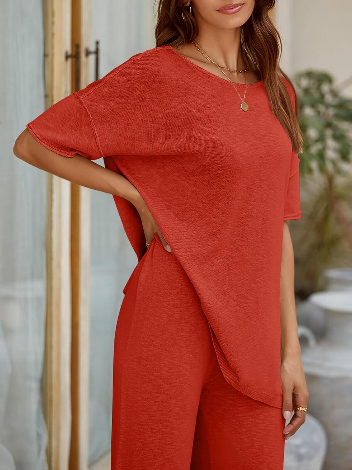 Tankaneo Women’s 2 Piece Travel Outfits Casual Short Sleeve Knit Sweater Set Wide Leg Pants Lounge Sets Tracksuit(Red)