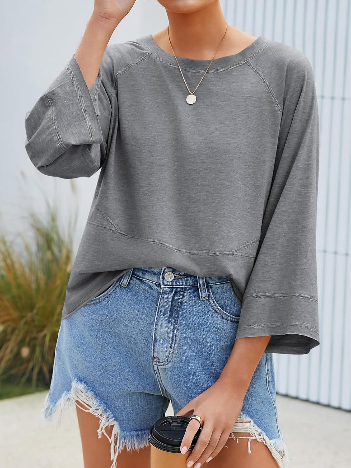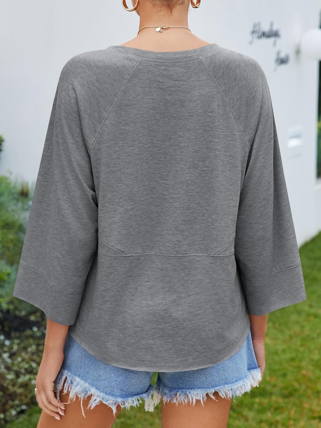 Tankaneo Womens 3/4 Batwing Sleeve Tops Casual Loose Fit Crewneck Shirts Fall Flowy Trendy Tees Blouse(Grey)