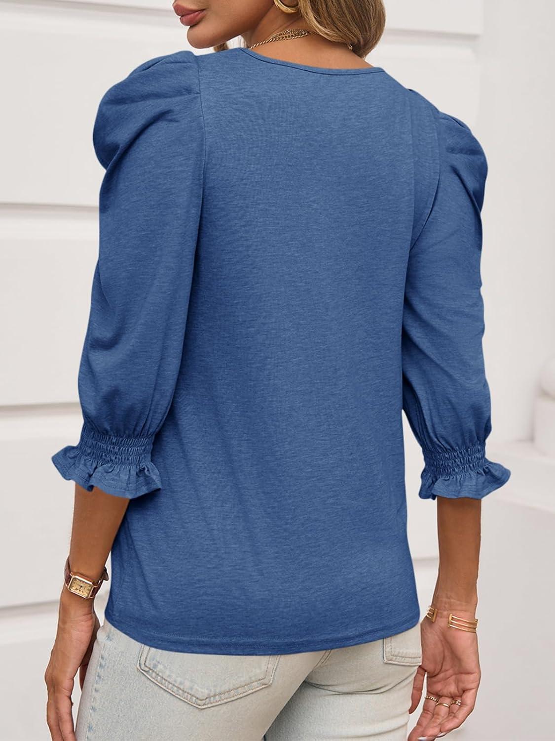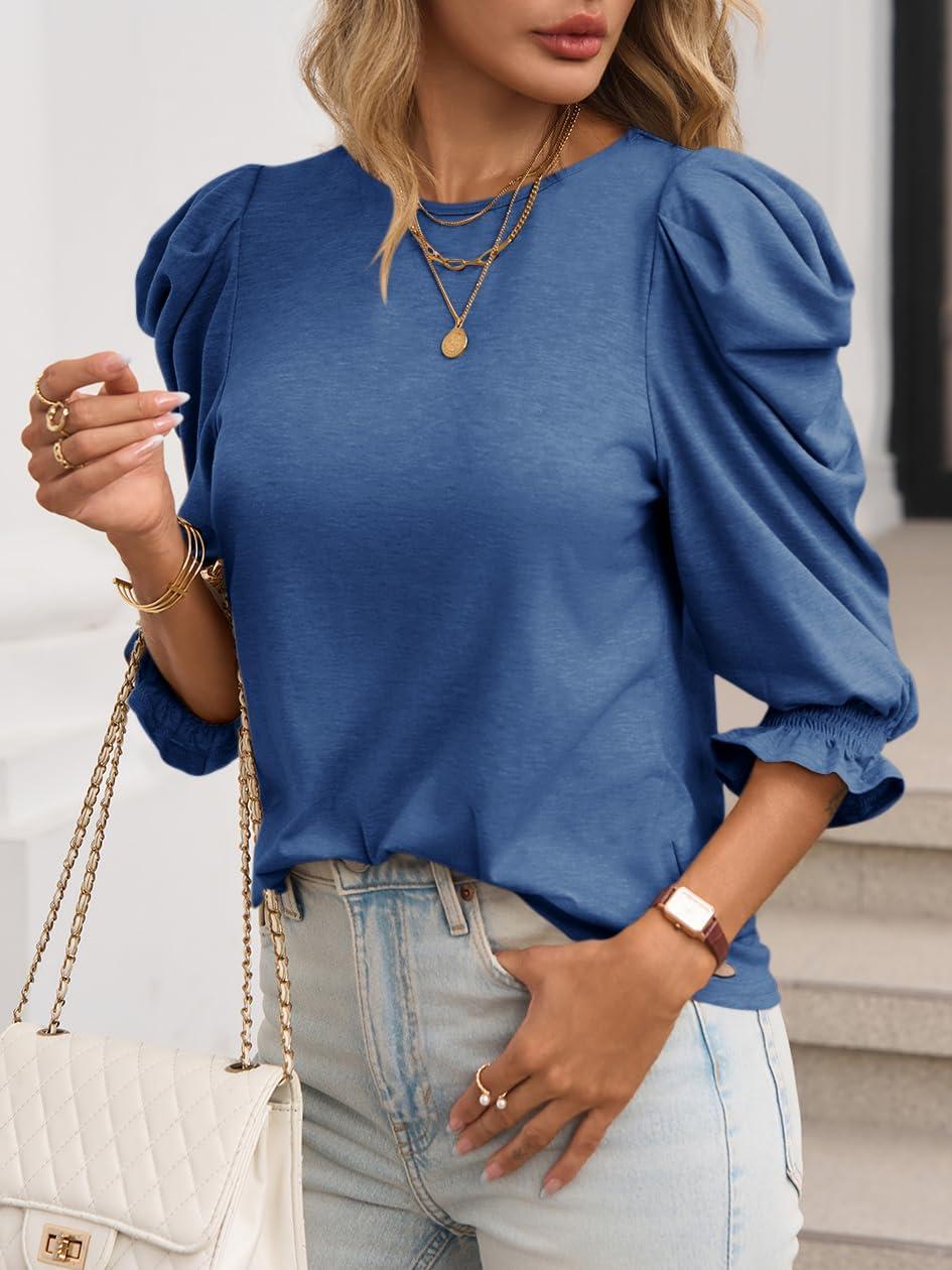 Tankaneo Womens 3/4 Length Sleeve Tops Dressy Casual Blouse Puff Sleeve Cute Trendy T Shirts with Smocked Cuffs(Navy Blue)
