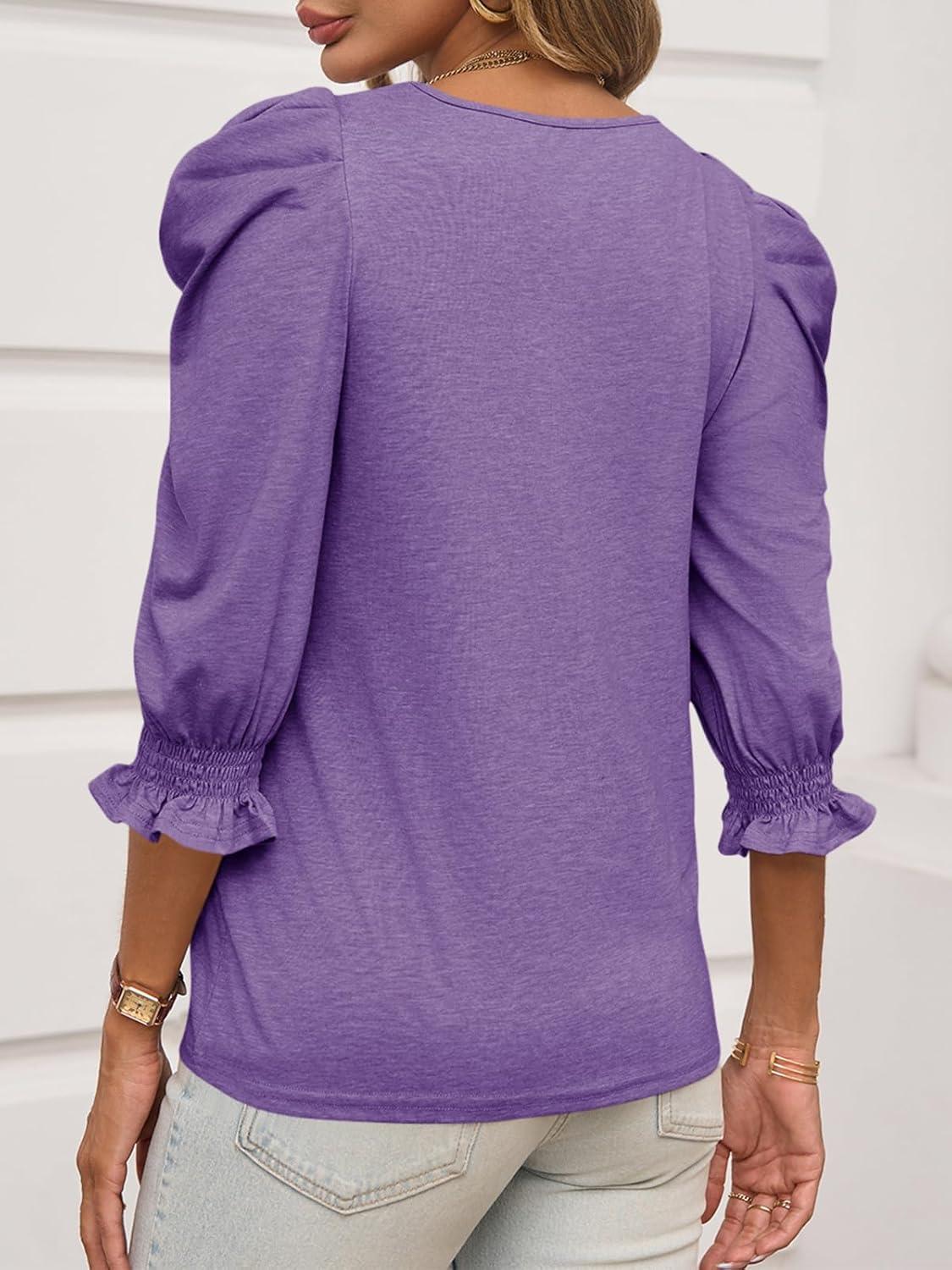 Tankaneo Womens 3/4 Length Sleeve Tops Dressy Casual Blouse Puff Sleeve Cute Trendy T Shirts with Smocked Cuffs(Purple)