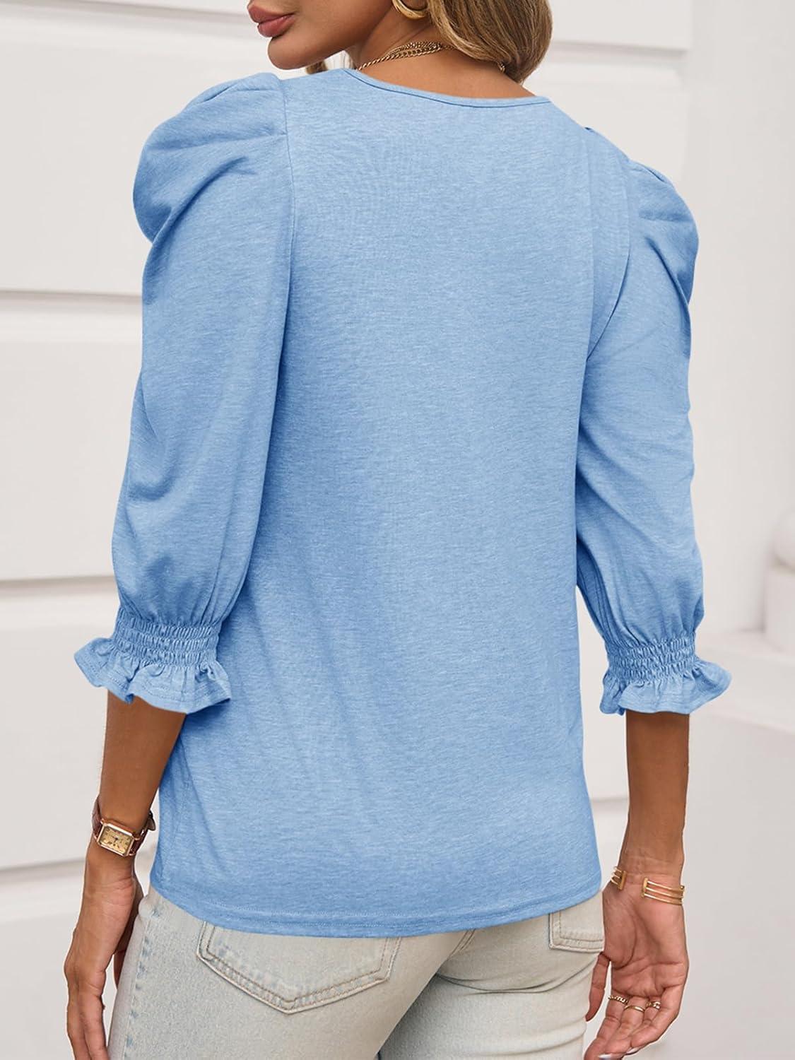 Tankaneo Womens 3/4 Length Sleeve Tops Dressy Casual Blouse Puff Sleeve Cute Trendy T Shirts with Smocked Cuffs(Sky Blue)