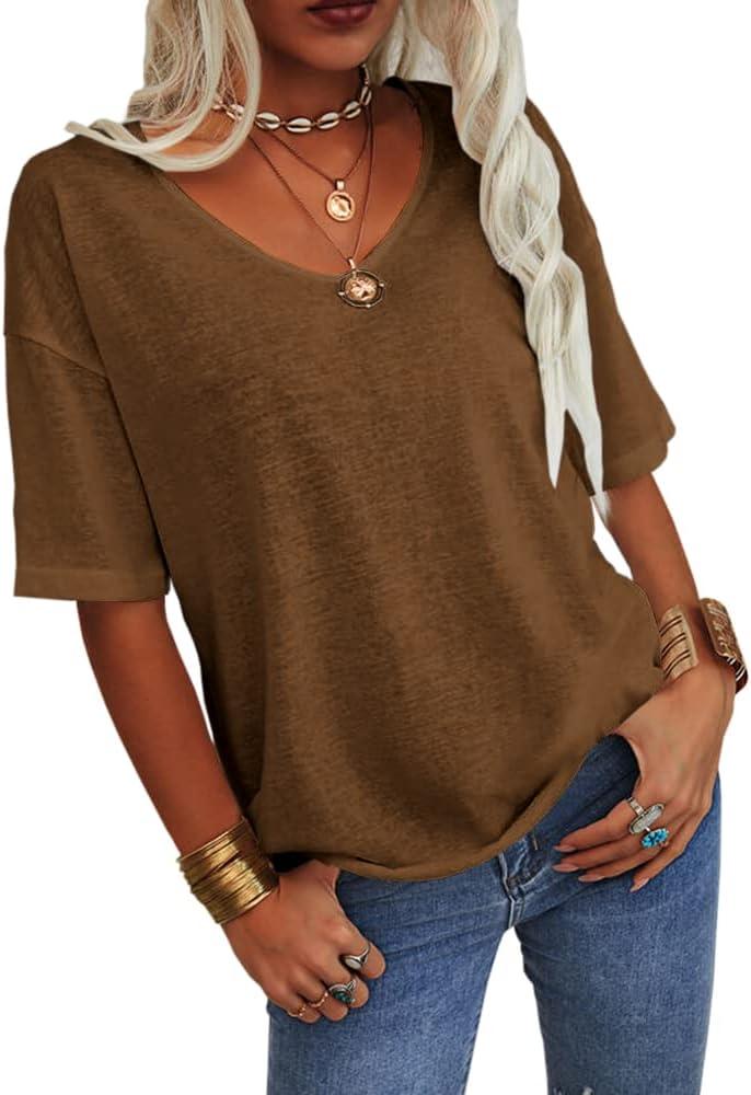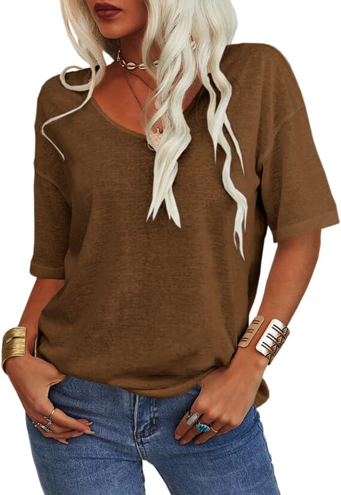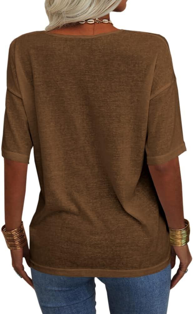 Tankaneo Women’s 3/4 Sleeve Shirts V Neck Loose Fitting Tops Casual Solid Color Tshirts Trendy Basic Tunic Summer Ladies Tops(Brown)