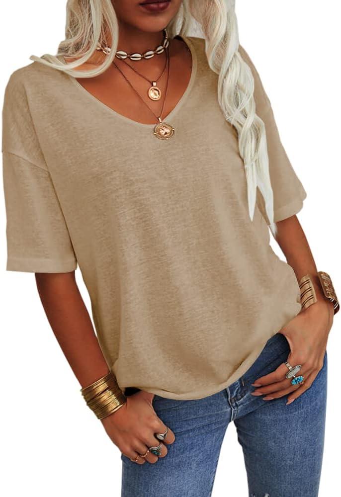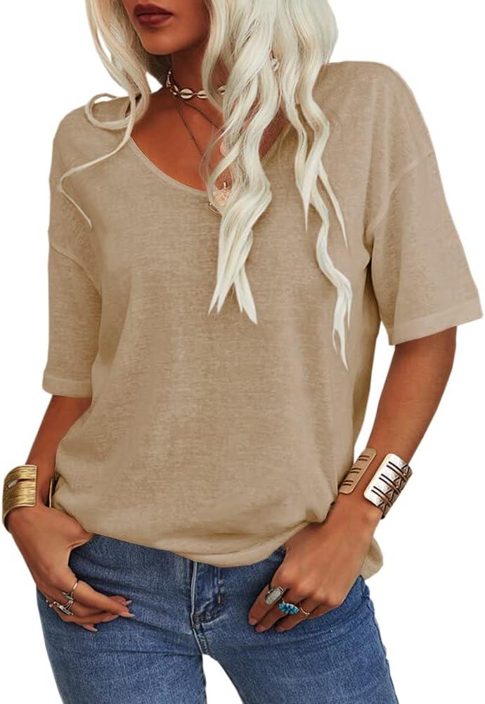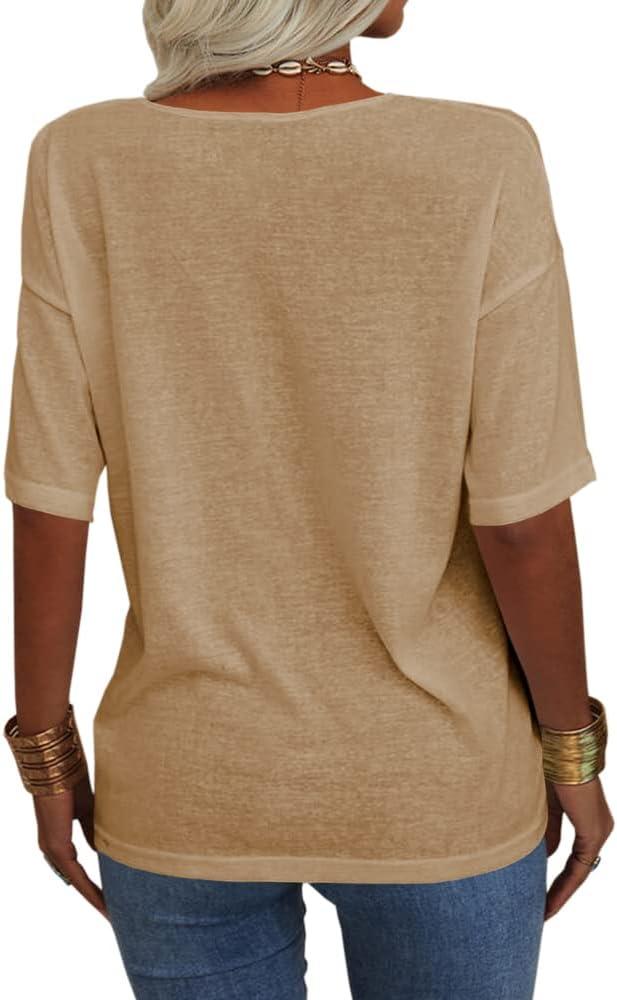 Tankaneo Women’s 3/4 Sleeve Shirts V Neck Loose Fitting Tops Casual Solid Color Tshirts Trendy Basic Tunic Summer Ladies Tops(Kaki)