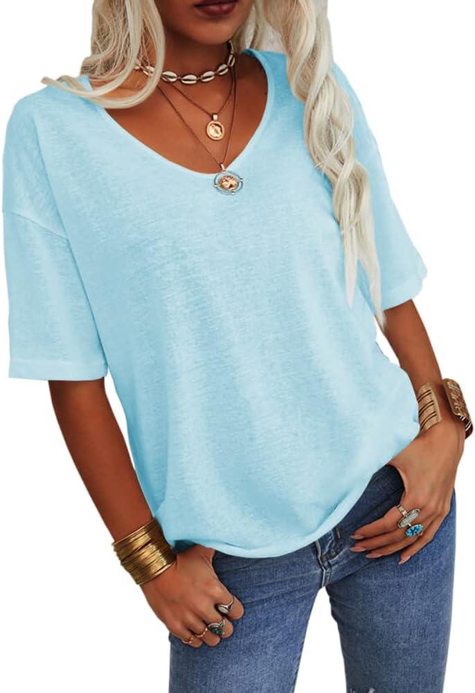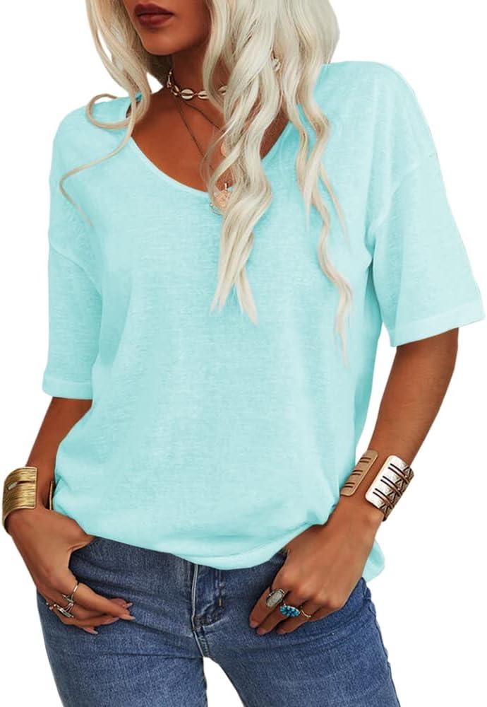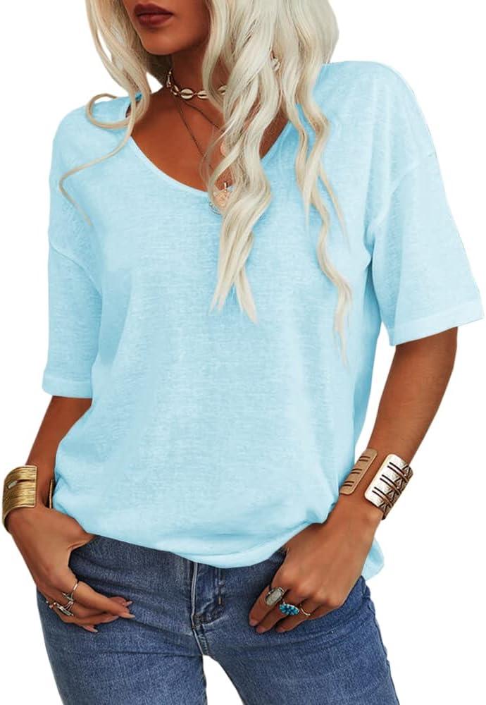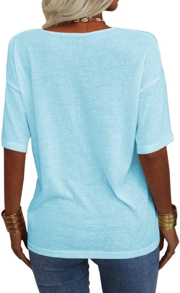 Tankaneo Women’s 3/4 Sleeve Shirts V Neck Loose Fitting Tops Casual Solid Color Tshirts Trendy Basic Tunic Summer Ladies Tops(Light Blue)