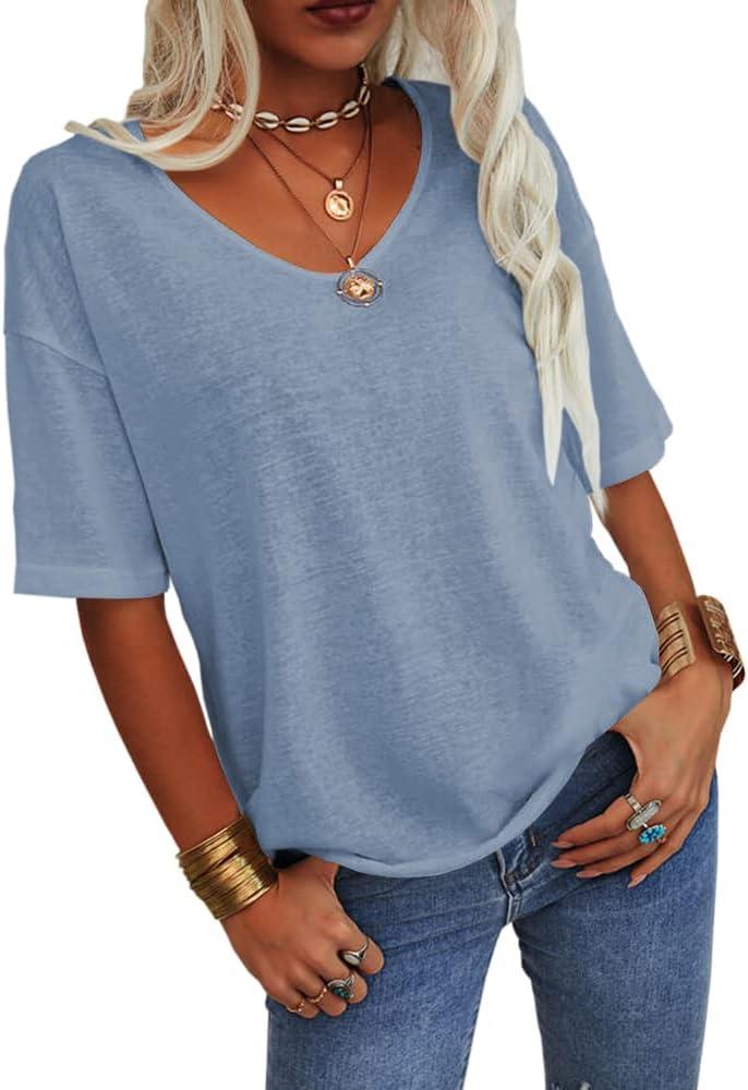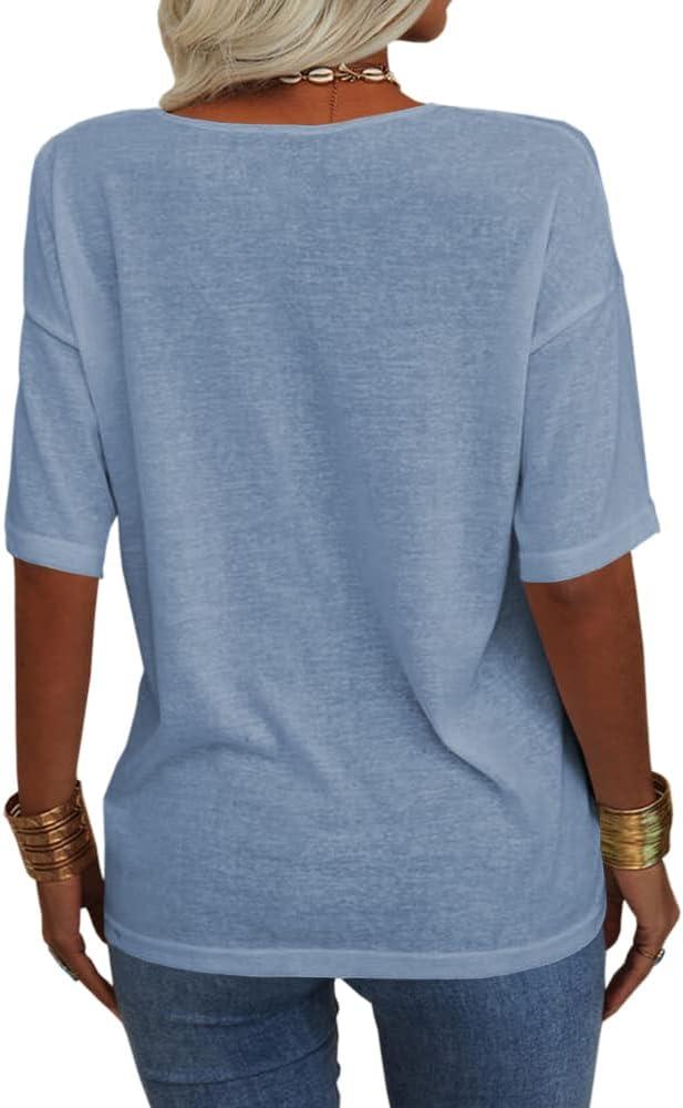Tankaneo Women’s 3/4 Sleeve Shirts V Neck Loose Fitting Tops Casual Solid Color Tshirts Trendy Basic Tunic Summer Ladies Tops(Sky Blue)