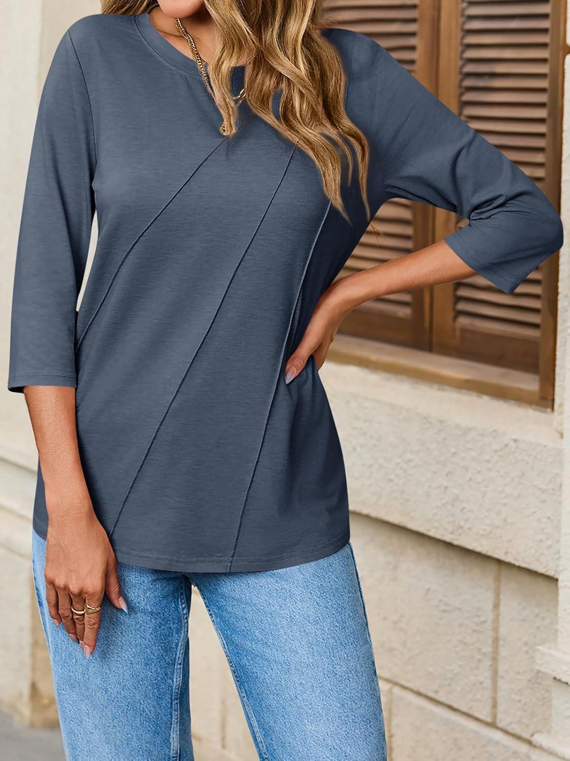 Tankaneo Womens 3/4 Sleeve T-Shirts Summer 2025 Crew Neck Blouse Dressy Casual Pleated Trendy Tops(Navy)