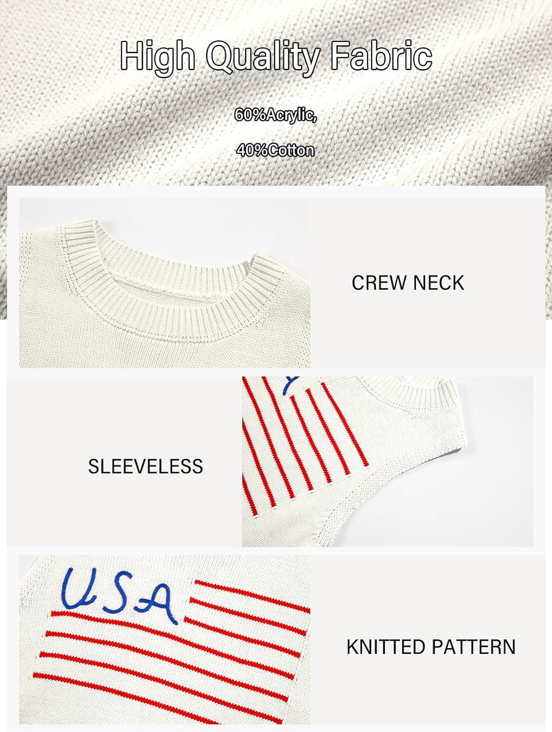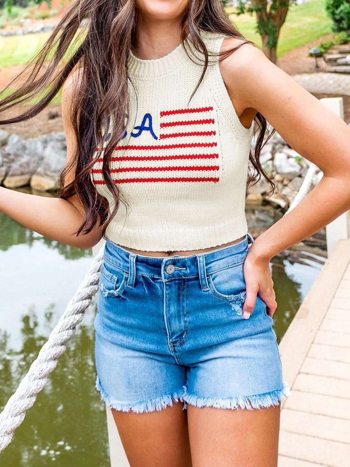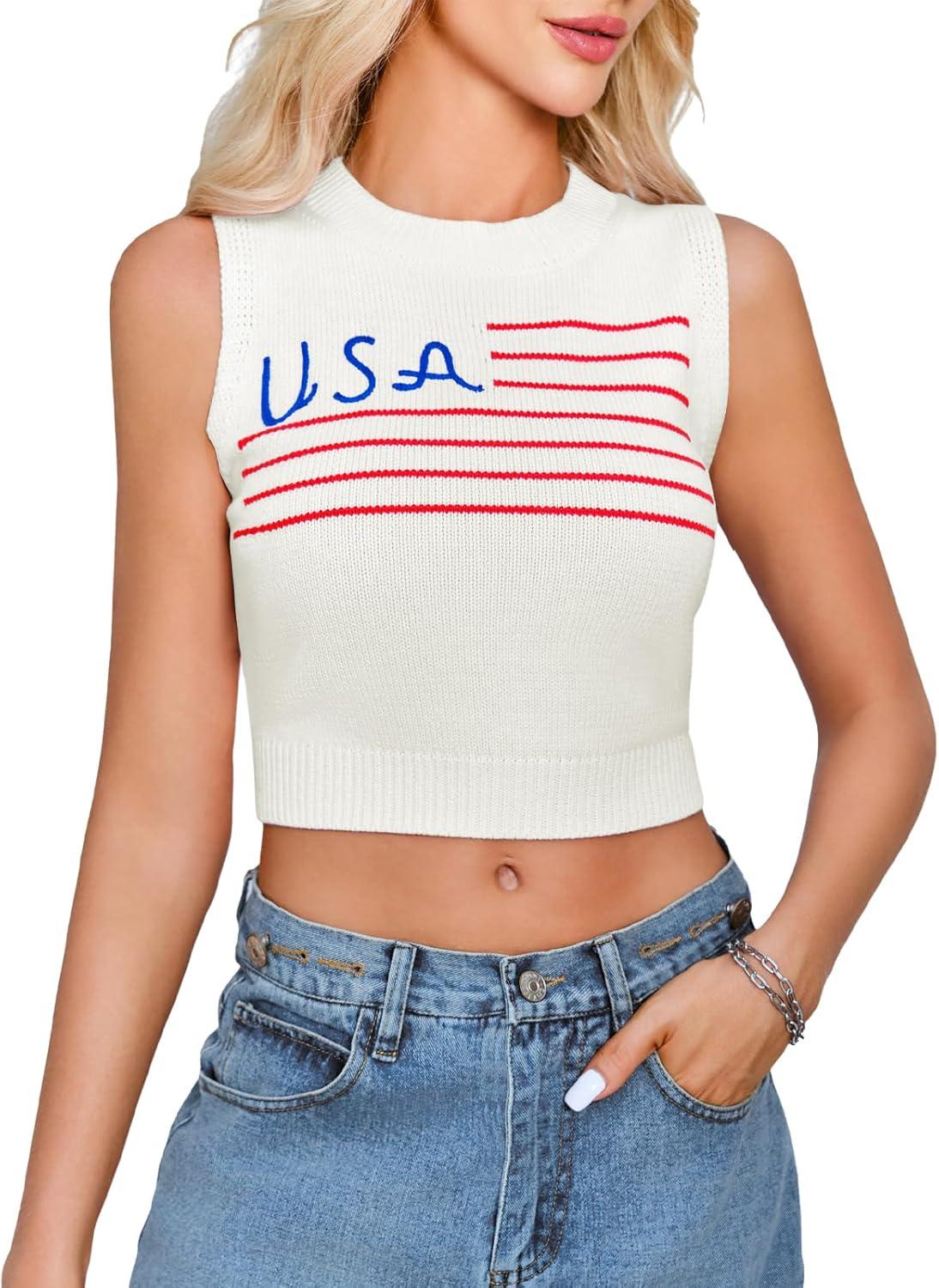 Tankaneo Womens American Flag Crop Tank Tops High Neck 4th of July Patriotic Summer Sleeveless Shirts Sweater Vest(White)