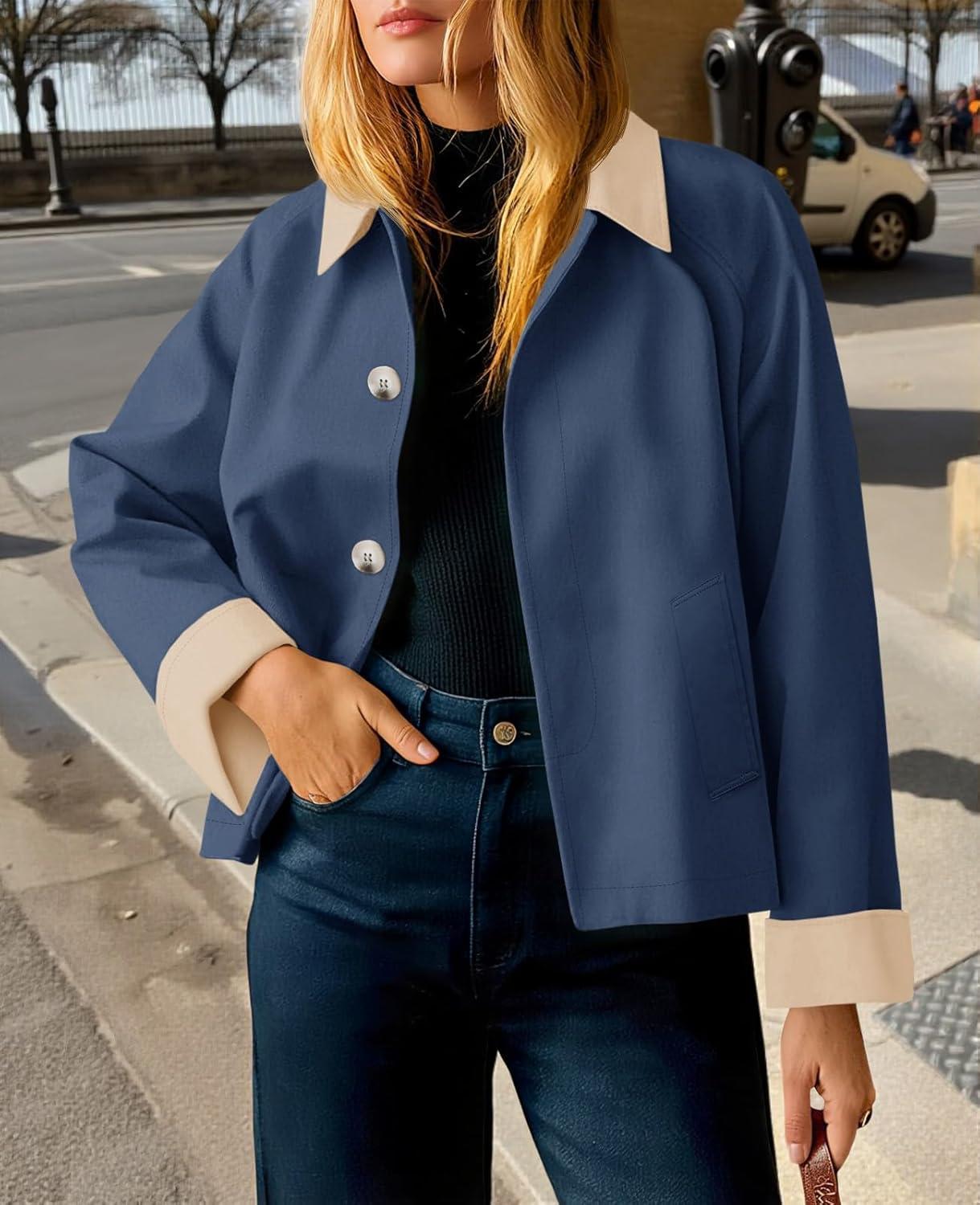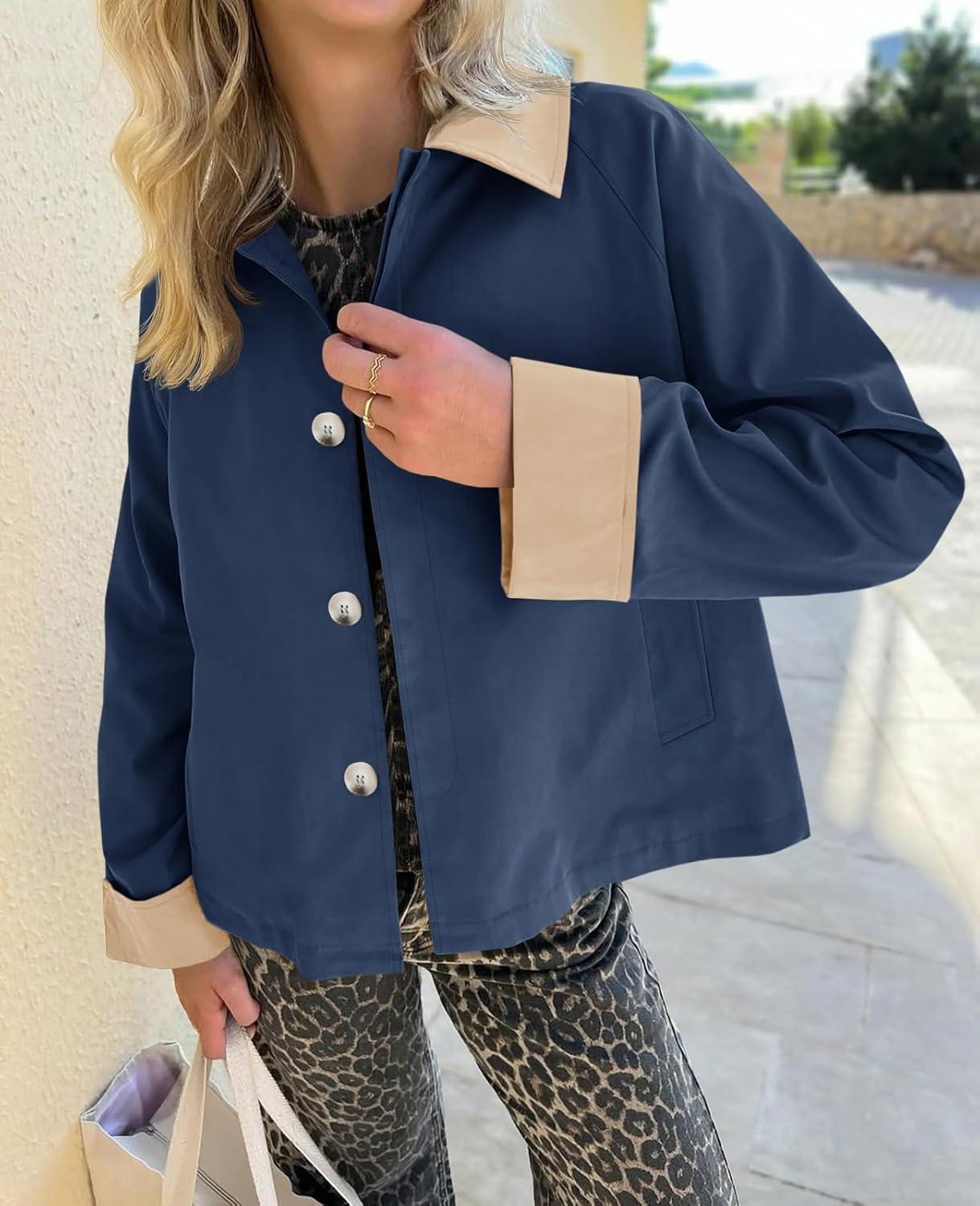Tankaneo Womens Barn Jackets Lightweight Casual Oversized Contrast Collar Jacket Crop Trench Coat Outerwear 2025 Fall Fashion(Navy)