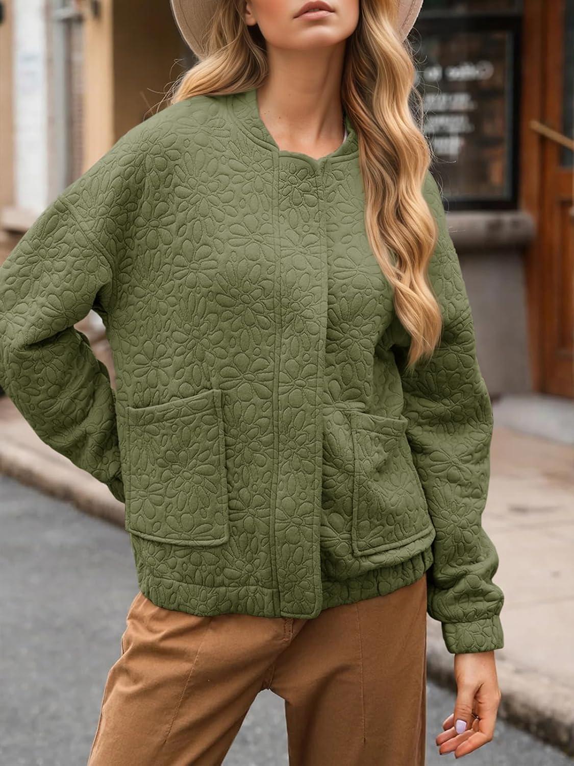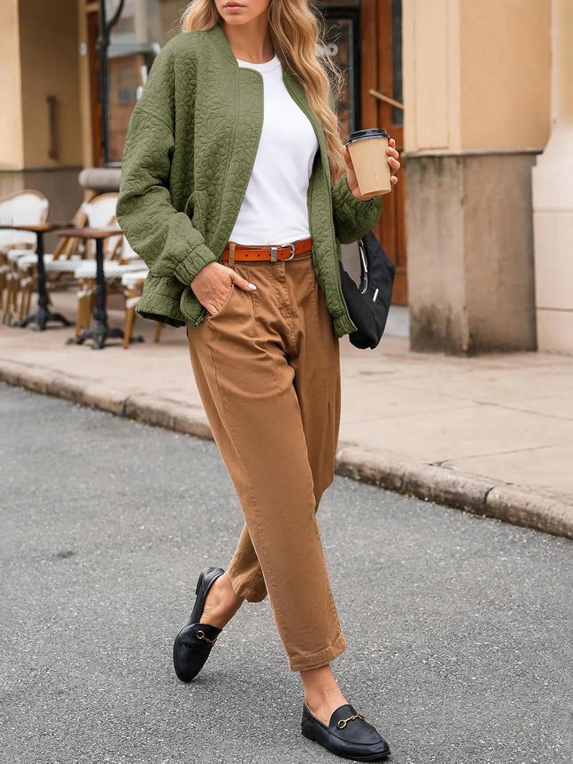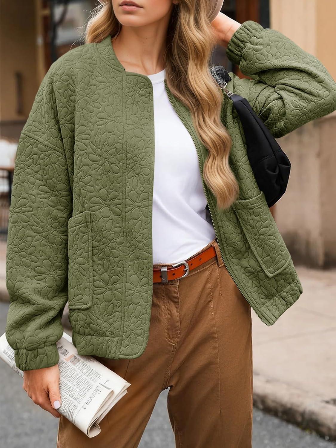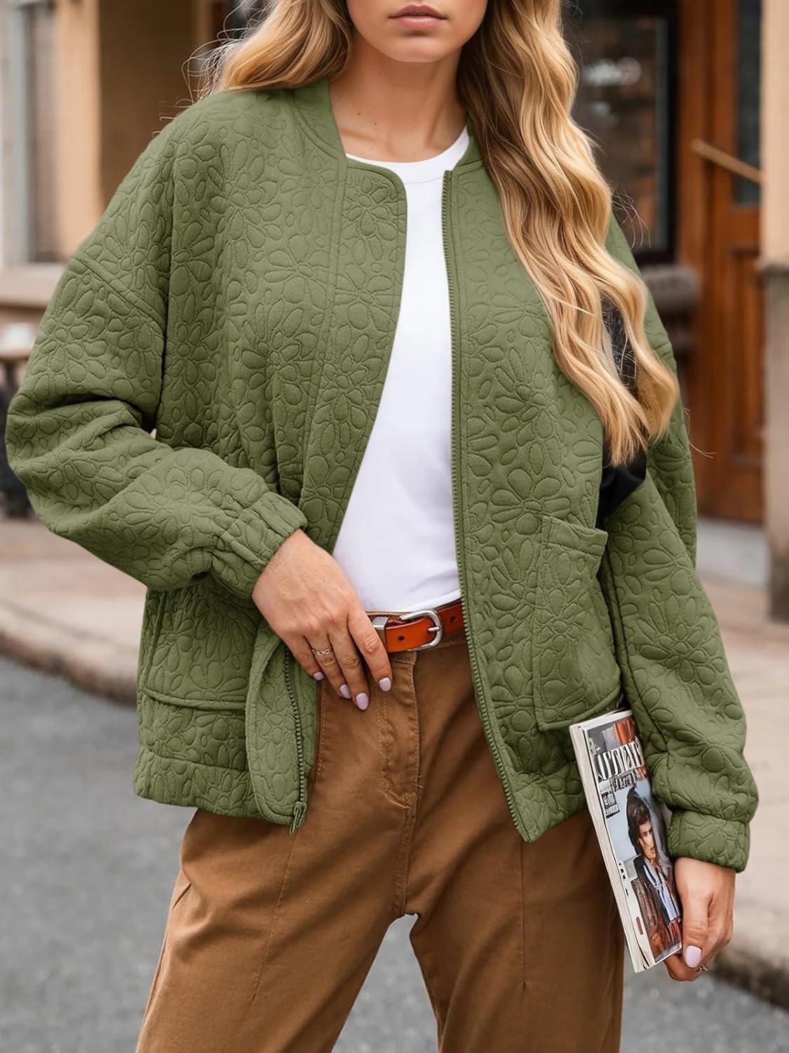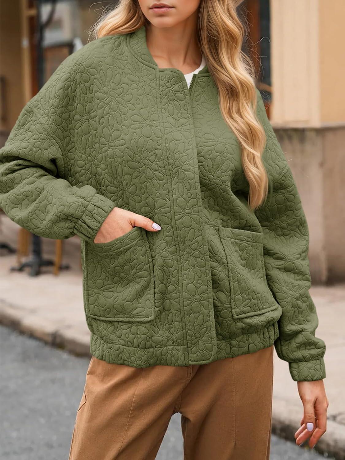 Tankaneo Womens Bomber Jackets Lightweight Zip Up Fashion Cute Jacquard Coats Fall Varsity jacket(Army Green)